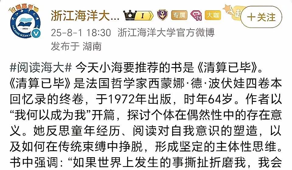 大新闻:究竟是“女拳”,还是“某奸”,为何多所高校官微选择同一天发波伏娃? 群众的眼睛有时是雪亮的,有时也是血红的。舆论和民意有时有扭转乾坤的伟大力量,有时也会成为洪水猛兽。 波伏娃所写的《清算已毕》,大约有关那个时代的“某奸”。据说她赞美了法西斯德军,甚至举报了本国的抵抗力量所在,造成有人被抓,因此在二战胜利后,遭到了清算。 假如据说的内容属实,那么被清算也算咎由自取。尽管如此,我依然不喜欢“清算”一词,在历史的某个阶段,“清算”曾带着森森的冷意,葬送了一两代人的青春。哪怕在当下,清算也带着报复的味道,与道德和法律格格不入。 为何复旦、哈工大、华中科技、武汉大学、浙江海洋大学等多家大学选择在敏感时间点不约而同地发波伏娃?是因为武汉大学事件带出来的女拳反弹,亦或是号称有70万信徒的某瓣生活组对民意别有用心的引导,暂时不得而知。 相信目前所有涉事大学官微均已删除,大家都在等待调查结果。我希望这个结果的呈现,是翔实的,理智的。真理与民意之间不能直接划等号,我希望这件事情的处理方式不是“清算”,而是诉诸相应的法律或道德。 能在滔天民意中,保持一份人间清醒,需要勇气,尤为难得。这恰恰是我们官方应该扮演的角色。