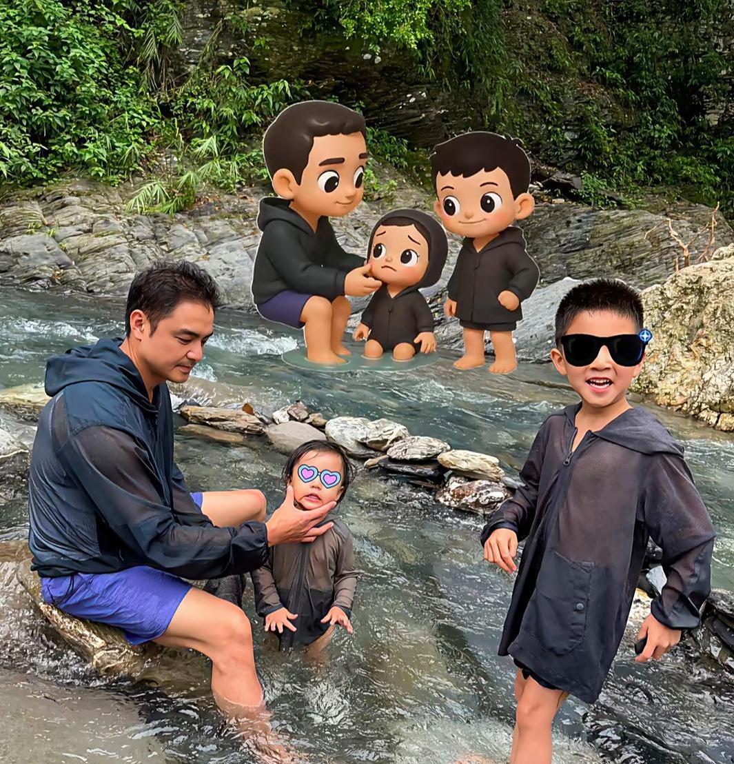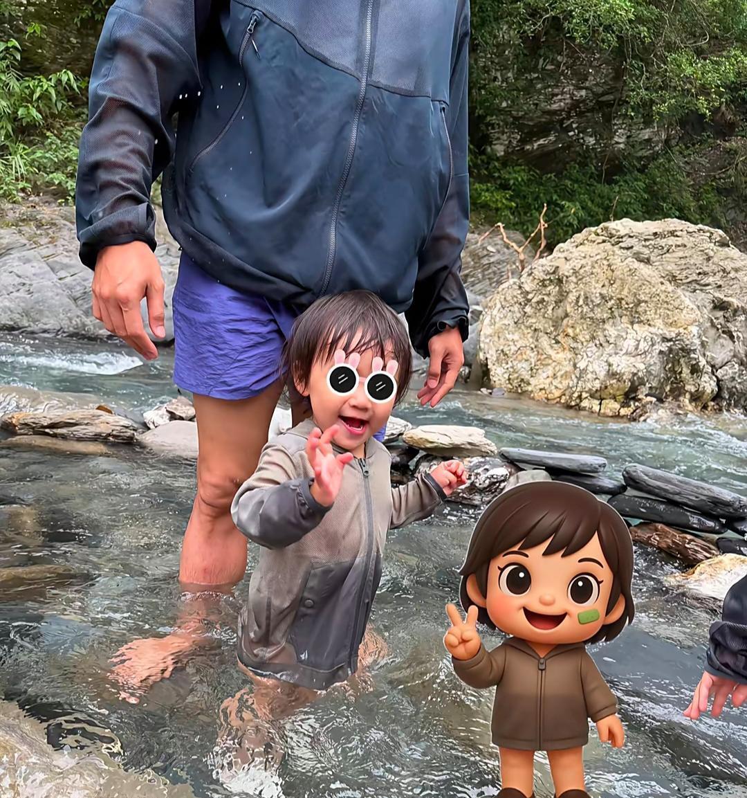 明道带一对子女到山区玩水,女儿长得很像他,两个孩子都好可爱。