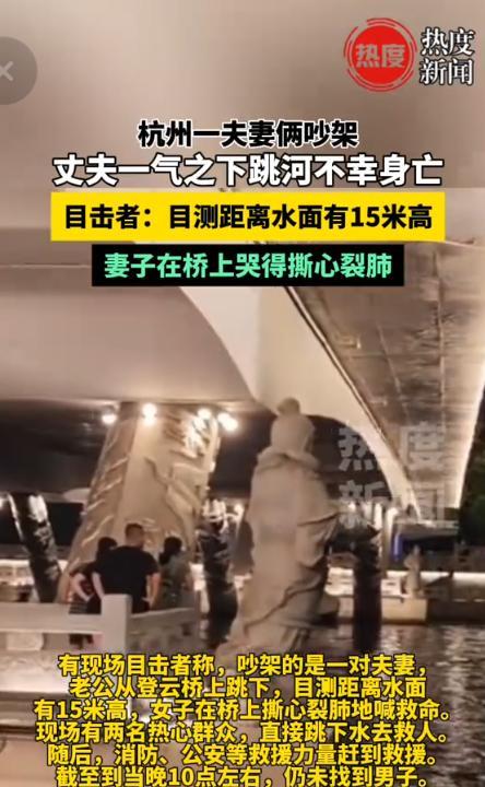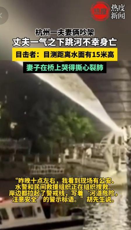冲动是魔鬼!杭州,一名男子正走在回家的路上,走过一座桥时,突然听到了不远处传来的争吵声。循声望去,他看到一对小夫妻,两人正在激烈争吵,情绪失控,声音越来越大。就在这时,男子目睹了让人惊愕的一幕,丈夫突然翻过栏杆,毫不犹豫地跳进了河里。网友:控制不住情绪,后果真的难以想象。 根据热度新闻8月4日的视频,这天一位男子正走在回家的路上,他刚路过一座桥,就远远的听到有一阵争吵声。 循声望去,他就看到似乎是一对小夫妻,两人情绪十分激烈,声音越吵越大,就在这时,两人中的一人突然翻过栏杆,直直的跳进河里,紧接着就是一阵尖叫。 男子连忙往那边走了几步,就听到一个女声大喊着救命,有人落水了,快来救命啊! 妻子的喊叫声很快就吸引了两位路过的大哥,两位大哥当即就跳了下去准备救人,找了一圈,都没有见到丈夫的身影。 也有好心人很快报了警,警察迅速的赶到,在周围拉上警戒线,专业的搜救人员开始下水寻找,然而天色越来越暗,到了晚上十点,丈夫依旧不见踪影。 一旁的妻子情绪激动的大喊大叫,甚至还想下去寻找,为了安全起见,救护车将妻子拉走送至医院。 终于经过几个小时的寻找,丈夫被打捞上岸,但此时,他已经没有了生命体征。 事情一出,网友纷纷表示,真的很可惜,情绪管理在生活中太重要了,冲动的行为可能会改变一生。 更有网友表示,看到这样的悲剧真的很心痛。夫妻之间的沟通很重要,遇到问题千万别让情绪失控,希望更多人看到这个案例后能反思自己在生活中的情绪反应。 对于这件事,大家有什么想说的呢?欢迎谈谈你的看法!