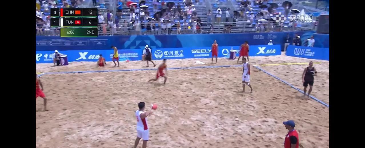 世运会沙滩手球这比赛挺有意思的哈哈!感觉是手球和沙滩足球的混合体。中国队这个项目还是有点实力,目前暂时领先突尼斯。沙滩手球看来中国队水平可以,不像之前软式曲棍球和单排轮滑球一样被吊打。