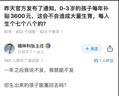 去厂里打螺丝一个月都有3000块了,你这一个娃一年才发3600,还只发三年,这能刺激生育?