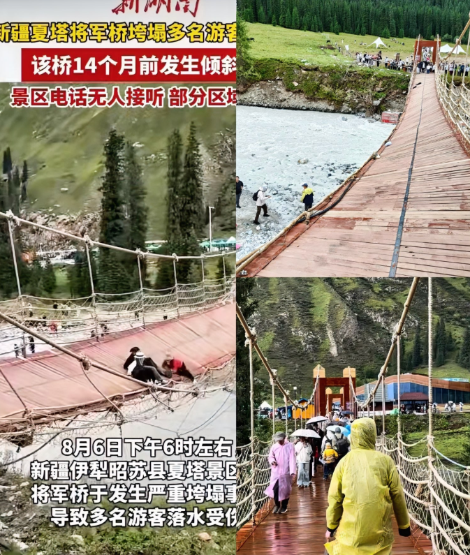 8月6日,新疆伊犁州昭苏县夏塔旅游风景区内,著名旅游打卡点“将军桥”坍塌,部分游客跌入湍急河流中,景区现场动用直升机进行救援。