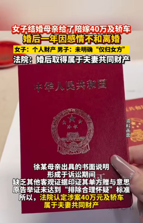 “这谁还敢结婚?”山东蒙阴,女子出嫁时娘家陪嫁40万和一辆车,离婚时却因这笔钱该归谁,闹到了法院。女方坚持是自己父母给自己的,男方却说是夫妻俩的共同财产,结果法院一锤定音!法官最终判定:这40万元现金和车辆,属于夫妻共同财产。理由也很明确——婚礼是在领证、婚后举办,娘家人高调公示,但没有任何证据显示这笔钱“仅赠女儿”。事后女方父母补写的声明,在法院看来属于“马后炮”,难以采信。