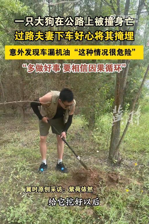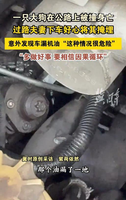 “万物皆有灵!”近日,内蒙古,一对夫妻开房车自驾旅游,在国道上发现了一只被撞死的狗,二人不忍心让它遭到碾压,就将其带到一旁掩埋了。结果,竟意外发现车底有不明液体,经检查,才发现是发动机漏机油了,随时有可能起火!女子感慨:“到底是我们救了狗,还是狗救了我们?” 如今,不少年轻人都喜欢自驾旅游,但路上很难不保证发生意外,因此我们需要积累一定的经验,这样才能在意外发生时保持冷静。 据媒体8月6日的报道,辽宁的一对夫妻就喜欢自驾旅游,他们为此还买了房车,这天,二人行驶在内蒙古巴彦淖尔,欣赏沿途的风景时,男子突然发现前方路面上躺着一条大黄狗。 狗狗在地上一动不动,已经失去了生命,夫妻俩不忍心它的尸体再受伤害,就决定下车将其掩埋。 男子找来工具将狗的尸体带到路旁,挖了一个大坑将其安葬,就在男子返回房车时,突然发现车下面有液体流出。 男子急忙打开引擎盖,发现是机油泄露了,于是便联系了修理厂,对方表示这种情况千万不要打火,要不然有可能起火。 二人听后只感觉一阵后怕,当时要是没有停车下来埋狗,再这样开下去可能就要命丧火海了,真的不知道是他们救了狗狗,还是狗狗救了他们。 网友看后表示,善良的人一定会有好运的,冥冥之中是他们的善良救了自己! 大家对于这件事是怎么看? 信息来源:《夫妻掩埋被撞大狗意外发现车漏机油》天下泉城