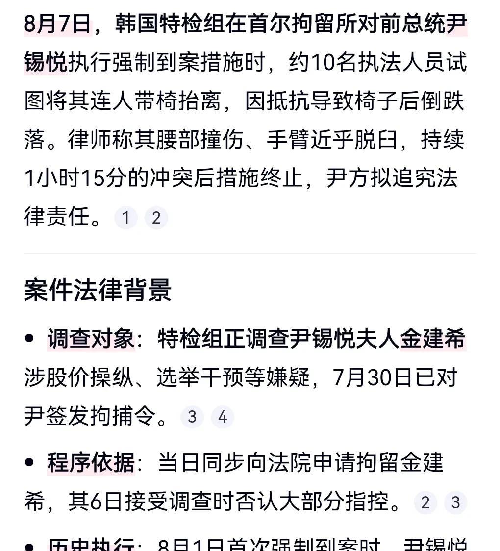韩国的法律让人看不懂。 此前一群人想带走尹锡悦。 由于尹锡悦强烈反抗。 没想到这个事情就不了了之了。 这样太没威信了。 尹锡悦拒捕过程:被连人带椅子抬起。 律师说手臂都快拉脱臼了。 尹锡悦甚至要追究那群人的责任。 10个人左右的团队竟然搞不定一个尹锡悦,真是匪夷所思。
