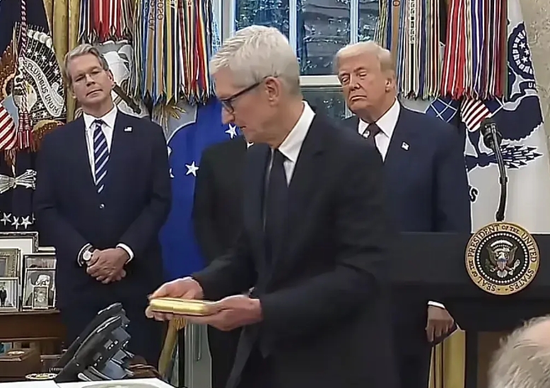 库克又给特朗普送钱,这次是明送一大块24K纯金底座,再附送一块亚克力。 今年特朗