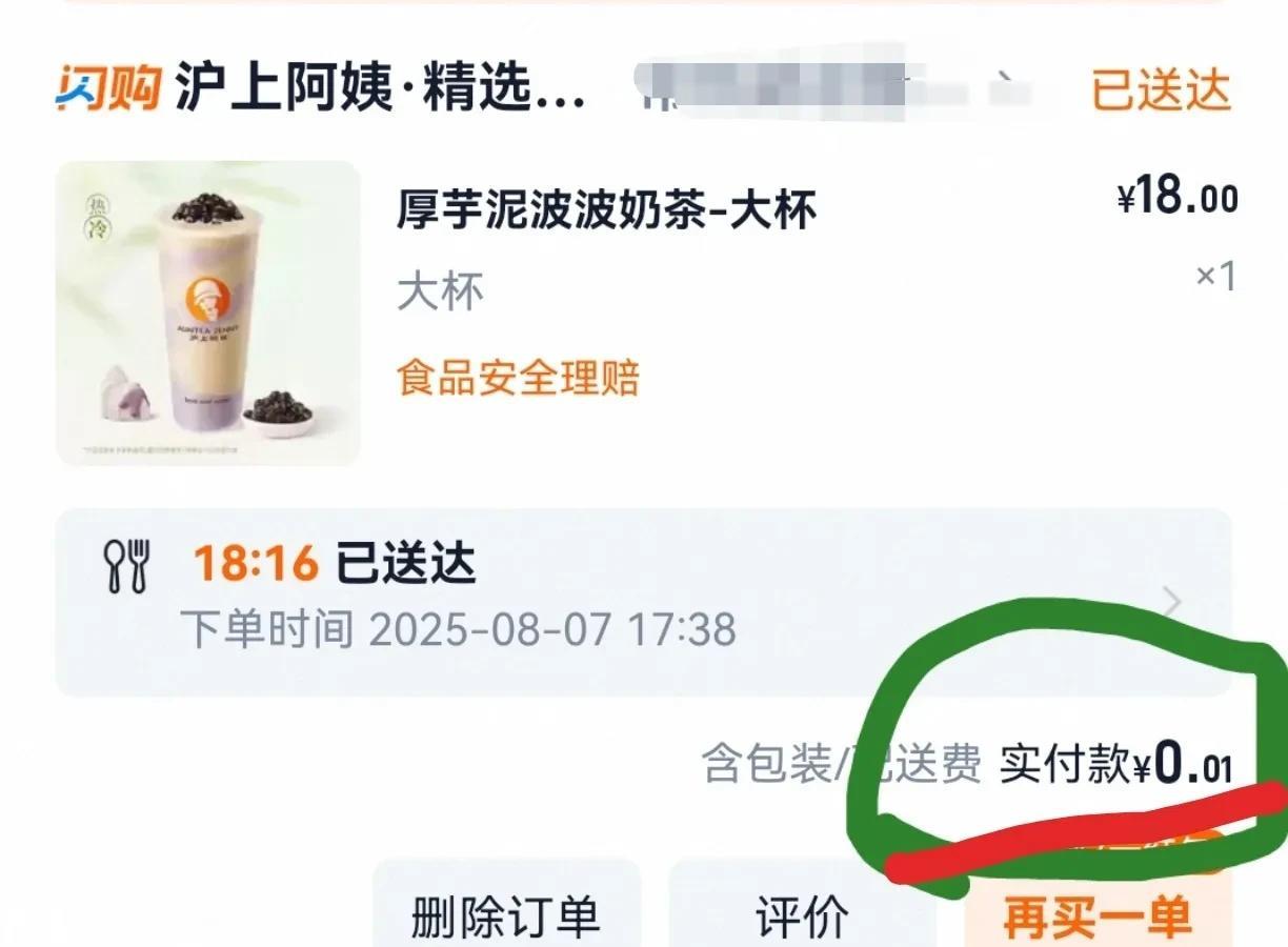 傍晚时分去街上,刚到店里,都在说秋天的第一杯奶茶,说今天奶茶店奶茶卖爆了! 而且淘闪购有优惠券,有的只要一分钱。啊!真的吗?我有点不敢相信。 然后建议说赶紧也去抢一个! 赶紧打开淘宝,果真,一通操作后,确实只要一分钱啊。赶紧下单! 不过,今天点奶茶店的人实在是太多了!过了一个多小时才送达。 这真是秋天的第一杯奶茶呀!友友,今日立秋,你喝奶茶了吗? #万能生活指南#