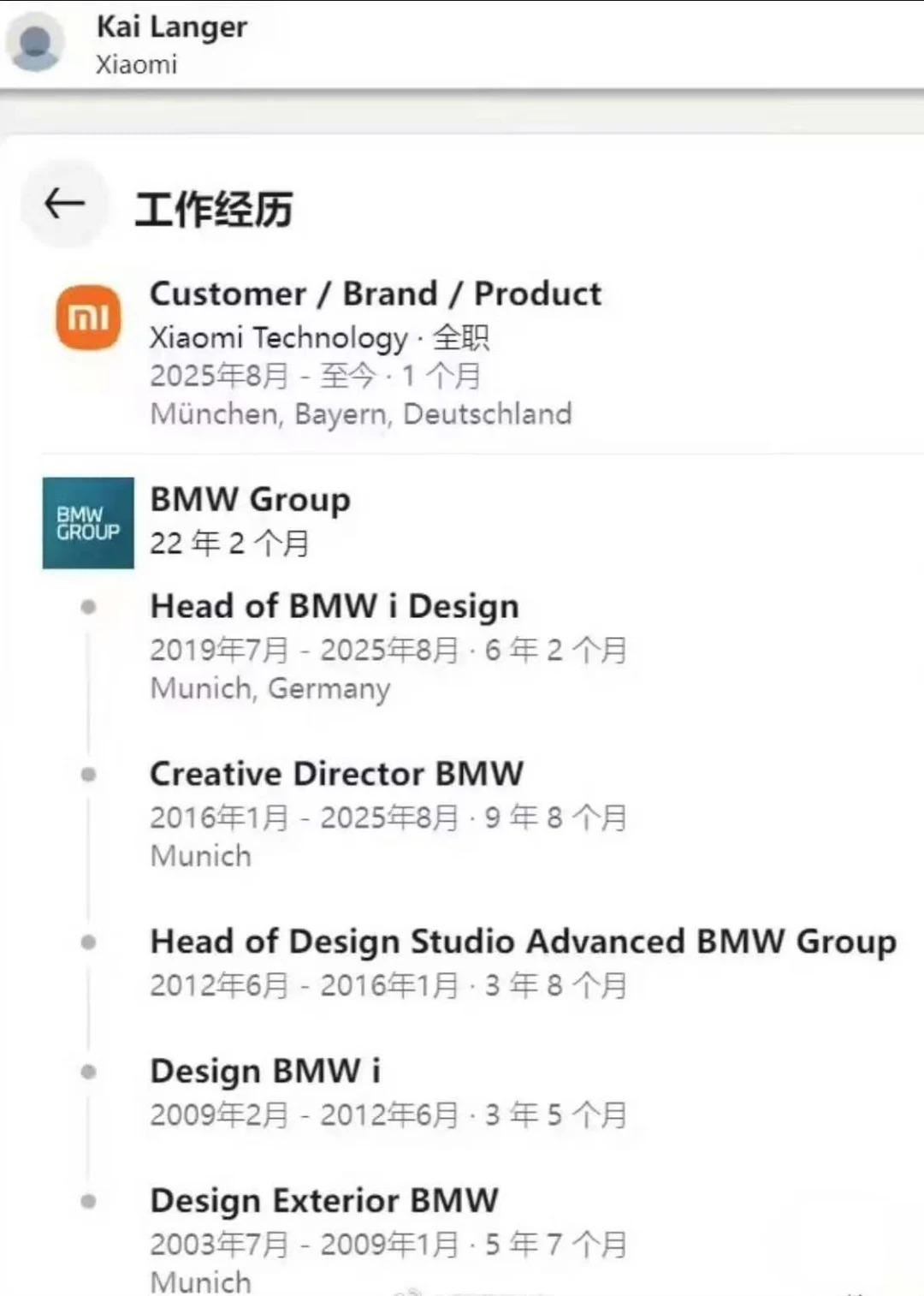 小米汽车渐入佳境,不但车子卖得好,而且团队也吸引到越来越多的高级人才加盟。 近日,宝马 i 系列设计主管 Kai Langer 宣布离开宝马,加盟小米汽车。 Kai Langer的领英资料已更新,显示其公司归属为小米,职位类别为客服、品牌和产品主管,工作地点在德国慕尼黑。 据了解,他在宝马工作了二十多年,自 2003 年起一直从事设计工作。 对于现东家Kai Langer 赞不绝口,称小米在科技和消费电子市场表现出色,并在汽车行业崭露头角,自己荣幸能成为小米团队的一员。 有业内人士推测认为,Kai Langer的加盟,说明小米汽车有意加码欧洲市场。