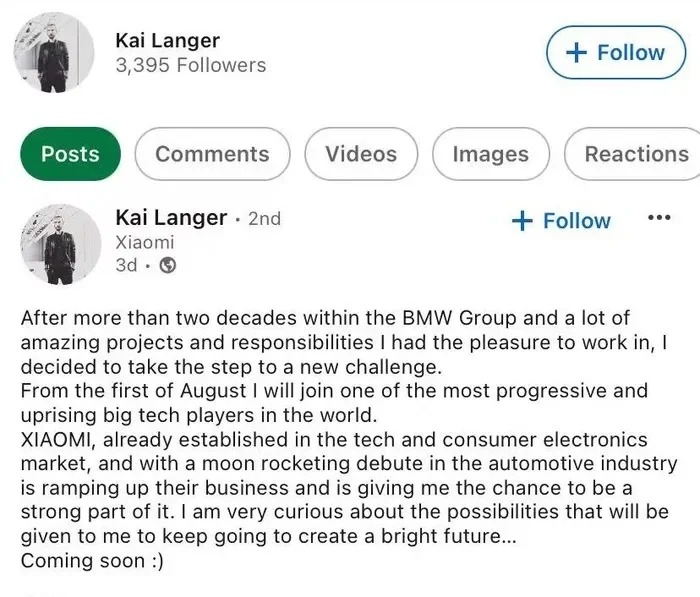 大事件,大新闻!宝马i系列设计主管Kai Langer 8月1日正式加入小米啦!在宝马干了二十多年,履历超牛,从初代宝马i3到i8都有他的设计印记,妥妥的汽车设计界大拿! 他自己说,是被小米迅猛的发展势头吸引。小米在科技和消费电子领域本就实力强劲,进军汽车行业后,首款车型SU7上市15个月狂卖超30万辆,新出的SUV车型YU7上市18小时订单超24万台,这成绩太炸裂! 其实,这不是小米第一次从传统车企“挖人”,之前就有不少宝马背景的人才加入。这次Kai Langer的到来,感觉小米汽车设计团队要起飞,未来车型设计说不定会有大惊喜,狠狠期待住了