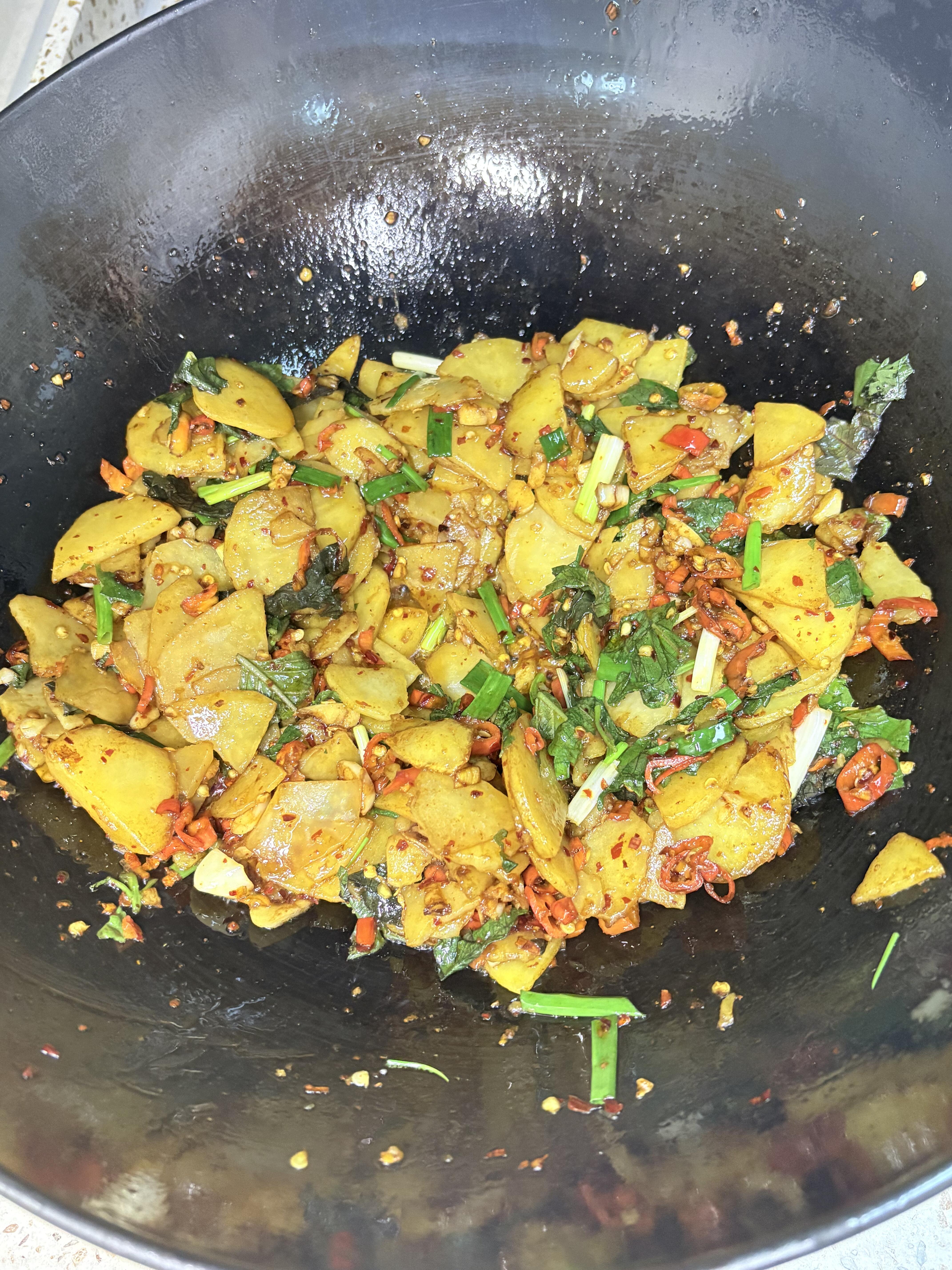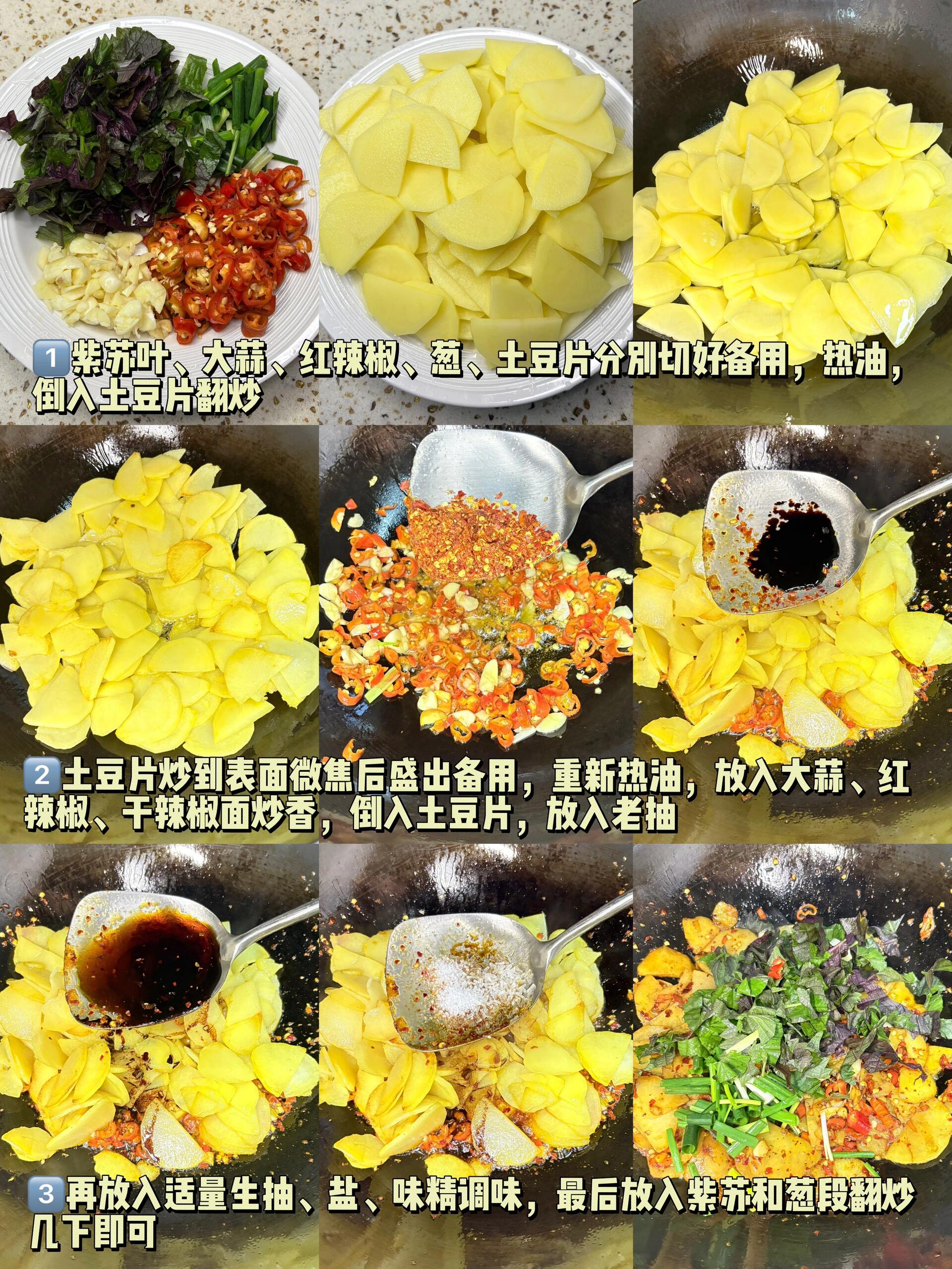 土豆新吃法,这样做真的超级无敌香 紫苏炒土豆片,香绝了!!又香又辣超级下饭!! 食材:土豆、紫苏、红辣椒、大蒜子、葱、干辣椒面 做法: 1、土豆切厚片(不能太薄)淘洗掉淀粉,其他配菜切好备用 2、热多一点油,放入土豆片,煎至表面微焦后盛出备用 3、留底油,放入红辣椒、大蒜子、干辣椒面炒香,放入土豆,放入老抽、生抽、盐、味精,翻炒均匀 4、最后放入紫苏叶、葱翻炒均匀即可