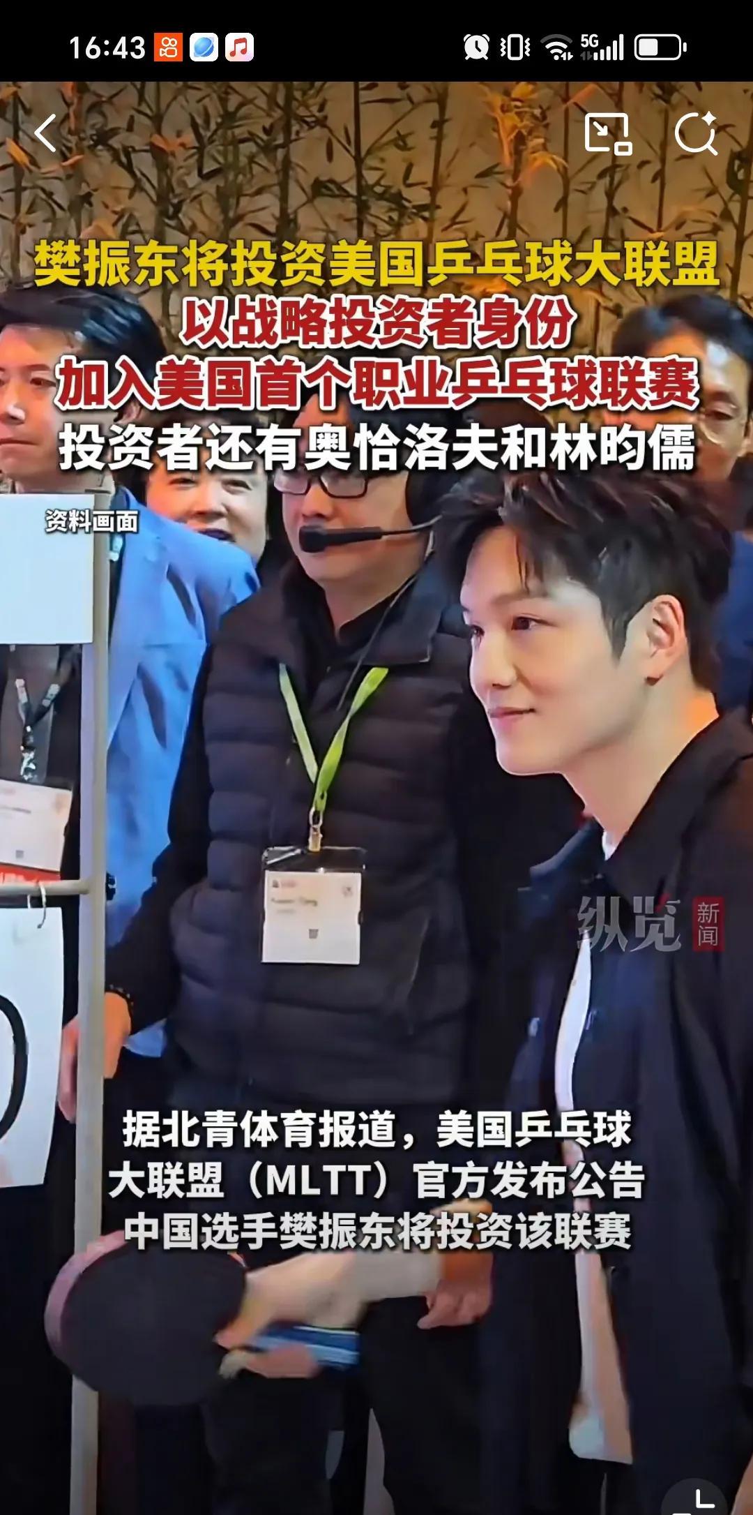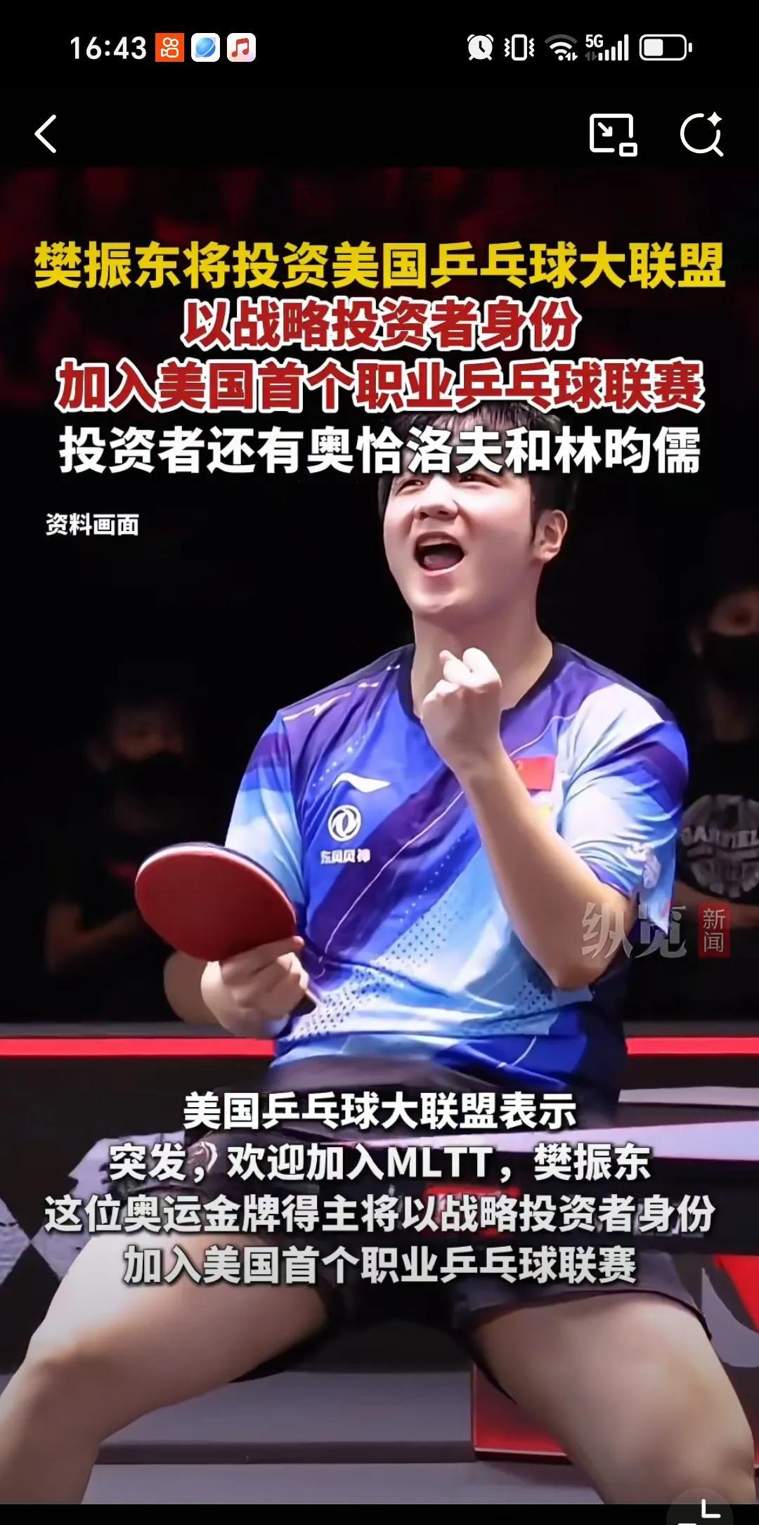 8月6日樊振东将投资美国乒乓球大联盟以投资者身份,其中投资者还有奥罗恰夫,林昀儒