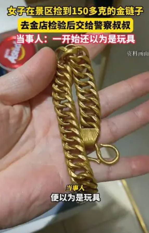 3月22号,在四川成都的一个景区里,有个姑娘玩着玩着,居然在地上捡到了一条沉甸甸的金链子,大约有150克重。这条链子看起来没啥标记,颜色也不那么新,姑娘一开始还以为是谁家小孩掉的玩具呢。但她心里还是嘀咕,就顺便拿到旁边金店去问问。