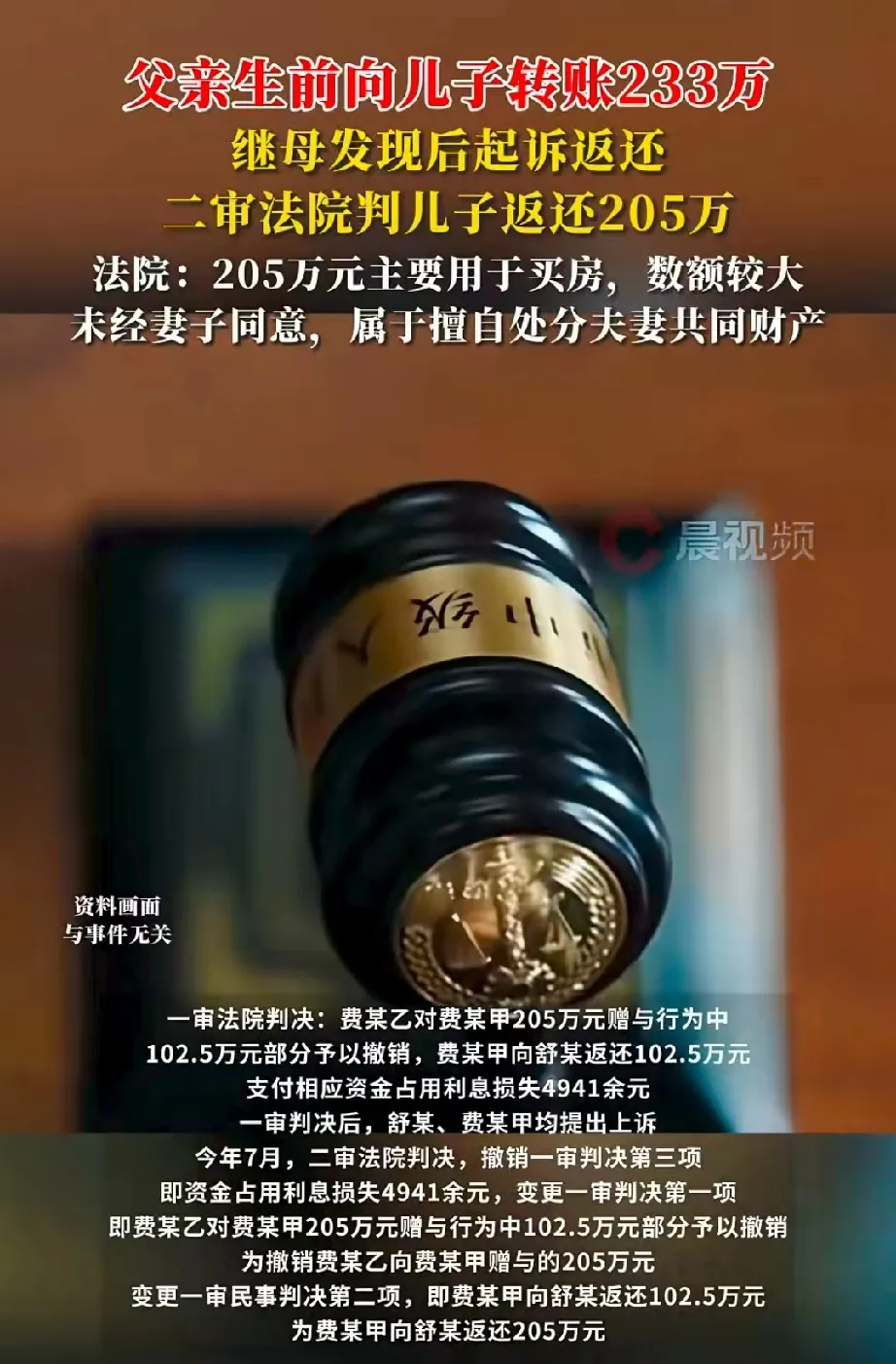 至于其余约27万元,因数额零散,转账次数不多,且大部分用于日常帮扶子女,法院认为不宜认定为不当赠与,不予返还。 一审判决小费应向舒某返还102.5万元,并支付约4941元利息。