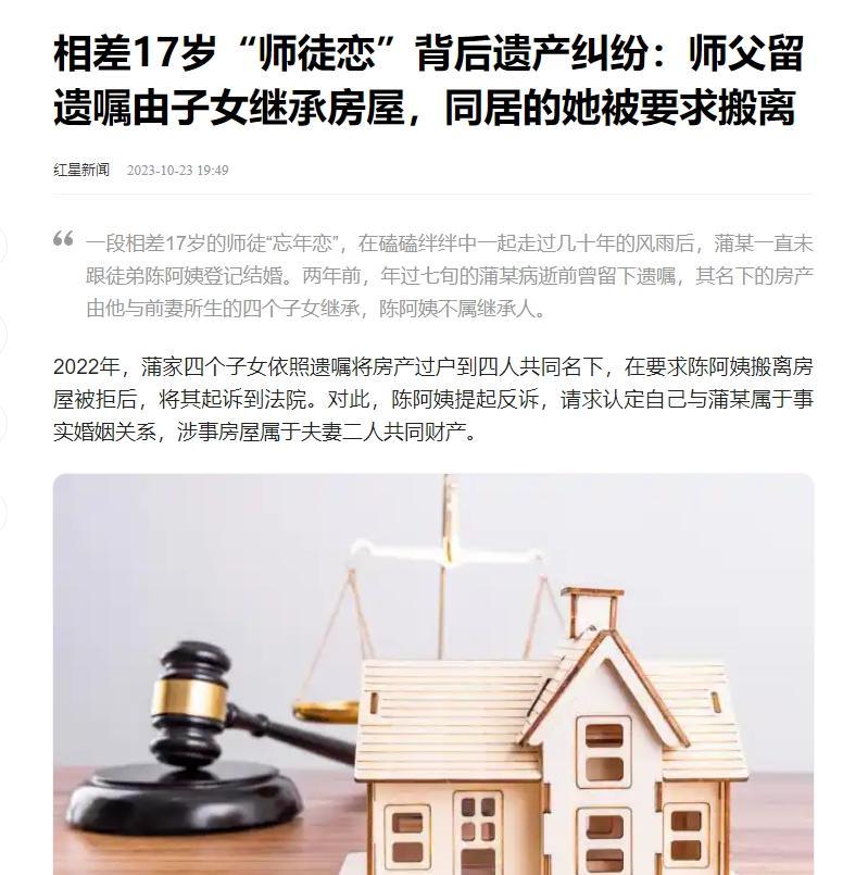 四川南充,大妈和大爷同居近40年,大爷死前留下遗嘱,把名下三居室和存款给4个儿女。他去世后,4儿女要求大妈搬走,被拒绝后把房子停水停电三个月,大妈还是不搬,4儿女起诉到法院,大妈却反诉。双方连打三场官司。法官在遗嘱上发现两处细节后,这样判了。 在四川南充这个地方,有一对男女同居快40年了,大爷临死前立遗嘱,把房子和钱全给了四个子女。子女们一狠心,停水停电逼大妈走人,她死扛着不搬,还反过来告他们。打了好几场官司,法官仔细一看遗嘱里的猫腻,判决出人意料。这背后藏着啥秘密?家庭恩怨怎么就闹到法庭上? 这个故事得从上世纪八十年代说起,陈大妈那时候二十多岁,蒲大爷四十出头。他俩因为学中医搭上关系,她拜他为师,学采药看病,慢慢就走到一块去了。蒲大爷有老婆孩子,她也有未婚夫,可他们不管不顾,她退婚,他离婚,就这么住一起了。但蒲大爷离婚后,没让前妻走人,一大家子挤一屋,闹得鸡飞狗跳。村里人看不惯,闲话满天飞,孩子们从小就记恨陈大妈,觉得她拆散了家。 蒲大爷的四个子女,长大后更恨她。大儿子、二儿子、小女儿他们明白爸妈离婚的来龙去脉,童年过得苦哈哈,妈带着他们受罪,这笔账全算在陈大妈头上。陈大妈呢,跟着蒲大爷几十年,从年轻姑娘熬成老太婆,没领证,没名分,受尽白眼。她三十九岁那年,受不了了,跑去广东打工,结果出车祸,蒲大爷带大儿子去照顾,她伤好后,两人又以夫妻名义开诊所,过日子。 后来,陈大妈四十九岁回南充照顾生病的爸,蒲大爷七十多岁也跟过去,在南充租房开诊所,她伺候他,安稳过晚年。可2021年,蒲大爷查出癌症,病得快不行了,还咬牙买了套二手三居室,房产证上就他一人名字。子女把他接回成都住院,陈大妈陪着,但后来被打发回南充。蒲大爷临死写遗嘱,把房子和存款给子女,还特意加了句陈大妈不享有所有权。子女没告诉她爸死了,直接埋了,然后上门要她腾房。 陈大妈不干,子女就玩狠的,停水停电三个月,她硬挺着。子女告法院,说遗嘱房产证都在手,继承权是他们的。陈大妈反告,说她和蒲大爷是事实夫妻,房子该有一半是她的。官司打到一审,法院判子女胜,她不服上诉。二审调解,法官劝子女给点钱让她走,他们不答应。二审驳回,双方又上诉到中院。 中院审下来,焦点是俩人算不算事实婚姻。法律上,1994年2月1日后,就没事实婚姻这说了,但蒲大爷和前妻1985年离婚,陈大妈这些年照顾蒲大爷,帮子女分担了赡养义务。法官看遗嘱,发现两处细节:蒲大爷亲笔写的不让陈大妈享有所有权,但没说不让她住,意思可能是同意她住着。另外,买房时间是2021年,他癌症晚期,还特意在南充买,子女都在成都,他干嘛不在成都买?很可能就是为陈大妈留个住处。 陈大妈后来让步,说不要一半产权,就让她住到死,她自己也得癌,没几年活头了。子女还是拒绝。2023年8月18日,二审判了,认定事实婚姻成立,房子是夫妻共同财产,陈大妈有50%产权,子女继承另一半。这判决一出,闹得沸沸扬扬。子女们为啥这么绝情?因为童年阴影太深,爸妈离婚,妈带他们吃苦,那恨一辈子放不下。他们争的不是房子,是那段被毁的童年。 陈大妈争的呢,又是啥?她陪蒲大爷近40年,从青春到白头,受人戳脊梁骨,到头来没个正经名分。她争的是自己那被耽误的一辈子。话说回来,这事搁谁身上都不好受。蒲大爷离婚没领证,留下一堆烂摊子。子女恨陈大妈没错,她当初插足别人家庭,也不是啥光彩事。法律判了判,可人心里的疙瘩解不开。 蒲大爷的房子是癌症时买的,钱可能是他个人,但因为事实婚姻认定,法院判成共同财产。遗嘱里那细节,法院解读成蒲大爷有意让她住,不想让她继承所有权而已。这点挺微妙,法官得仔细掂量立遗嘱人的意图。子女继承权是法定,但遗嘱能指定,可不能损害别人权益。陈大妈没继承权,因为不是法定继承人,但通过事实婚姻争产权。 同居死亡后,另一方没法定继承权,除非遗嘱指定或有遗赠扶养协议。蒲大爷遗嘱没给她啥,她靠反诉争来的。实务中,建议同居双方签书面协议,明确财产归属,留证据如转账记录啥的,避免打官司。婚外同居本身违反公序良俗,法院有时会考虑这点,但财产纠纷还是按证据走。 判决后,事实婚姻认定标准挺严,得看长期同居、以夫妻名义生活、有没有对外承认啥的。陈大妈有婚纱照证据,照顾几十年,法院认了。子女说她是护工,证据不足。遗嘱没写禁止居住,法院推定同意住,这解读有道理。买房时间点,癌症时在南充买,子女远在成都,意图明显。 大家看完这事,有啥想法?子女做得对不对?陈大妈该不该争?欢迎评论区留言,说说你的看法,说不定你的故事更曲折。