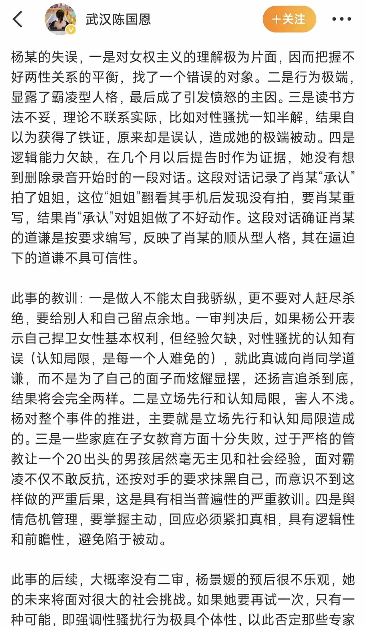 正义可以迟到,但一定会来。 今天,武汉大学首位教授站出来主持正义,为肖同学发声。 陈国恩,男,武汉大学人文学院副院长,教授,博士生导师。今天发帖公开为男同学肖某主持正义,并力除杨同学行为极端,性格霸凌。 在是非曲直面前,陈教授选择了伸张正义,是一股难得的清流。