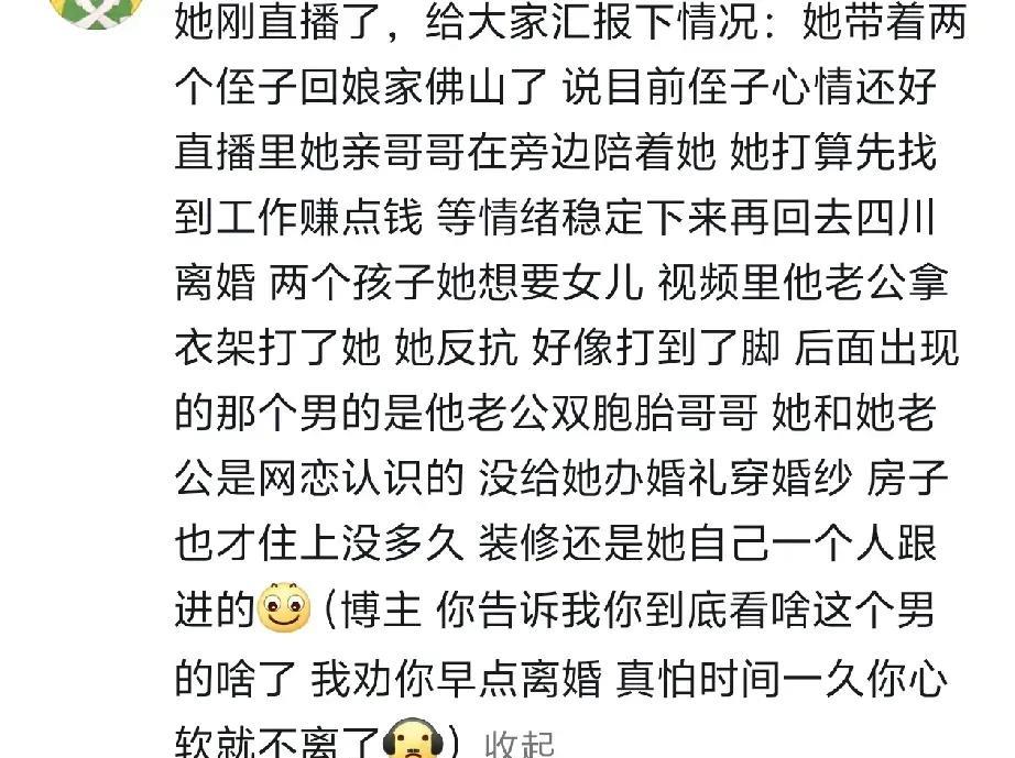 简直没天理!男子没吃到鸡蛋,妻子掀桌子后续来了,女子已经回到娘家佛山,打算先找到工作,然后准备离婚。离婚,她只要女儿,有两个孩子,一儿一女。 女生22年跟他结婚,说好的婚纱照办婚礼,一样都没兑现。妻子才25岁,俩人是网恋,妻子是从广东远嫁四川,而且没还是有婚纱照,没有婚礼的远嫁。 昨天看了原视频,这件事原视频足足有十五分钟,也就是说这男的说鸡蛋说了十五分钟,太窒息了。看着他老婆从吵到气得发抖到最终爆发掀桌,这男的居然还拿她老婆身上的衣服擦自己汤水浸湿了的衣服。 远嫁的悲哀,女的佛山的,男的四川的,就因为怀孕了,只扯了证,到现在孩子都2个了,婚礼也没办。暑假里,女的两个侄子来姑姑家,于是出现了这一幕,他问你凭什么吃我鸡蛋是对女的侄子说的。 不说别的,人家远嫁,还给你生了俩孩子,你啥啥没给,基本的婚礼都没有,怎么有脸这样做的。能够为两个鸡蛋吵成这样的男人优秀到极点,稍微正常一点的人都会想到小孩是老婆的亲戚。 即使他们做错了什么都不要当面发脾气,更何况是两个鸡蛋这种小事,可想而知女方在男方心目中只是免费的佣人而已。这跟哪里的女人哪里的男人没关系,这就纯属个人人品、个别现象。 真的是太奇葩了,现在还有人因为几个煮鸡蛋而生气,这家人得有多穷?现在还有人因为两个媳妇家侄子来家里住而生气,莫欺少年穷。两个大侄子、长大了也是自己孩子的亲戚,这得是啥智商? 女子嫁错人了,家里有客人,不管亲疏,不管年龄大小,客人优先,宁愿自己少吃不吃,才是待客之道。一个男人跟自己老婆斤斤计较一个鸡蛋,所以一个女人找对象,一定要看清男人的三观,还有他的原生家庭。 如果男人原生家庭积极阳光,家庭和睦,处理事情条理清晰,那是可以嫁的和。反之男人的家庭一塌糊涂,三观不正,斤斤计较爱较真,就是他说的天花乱坠也不行。