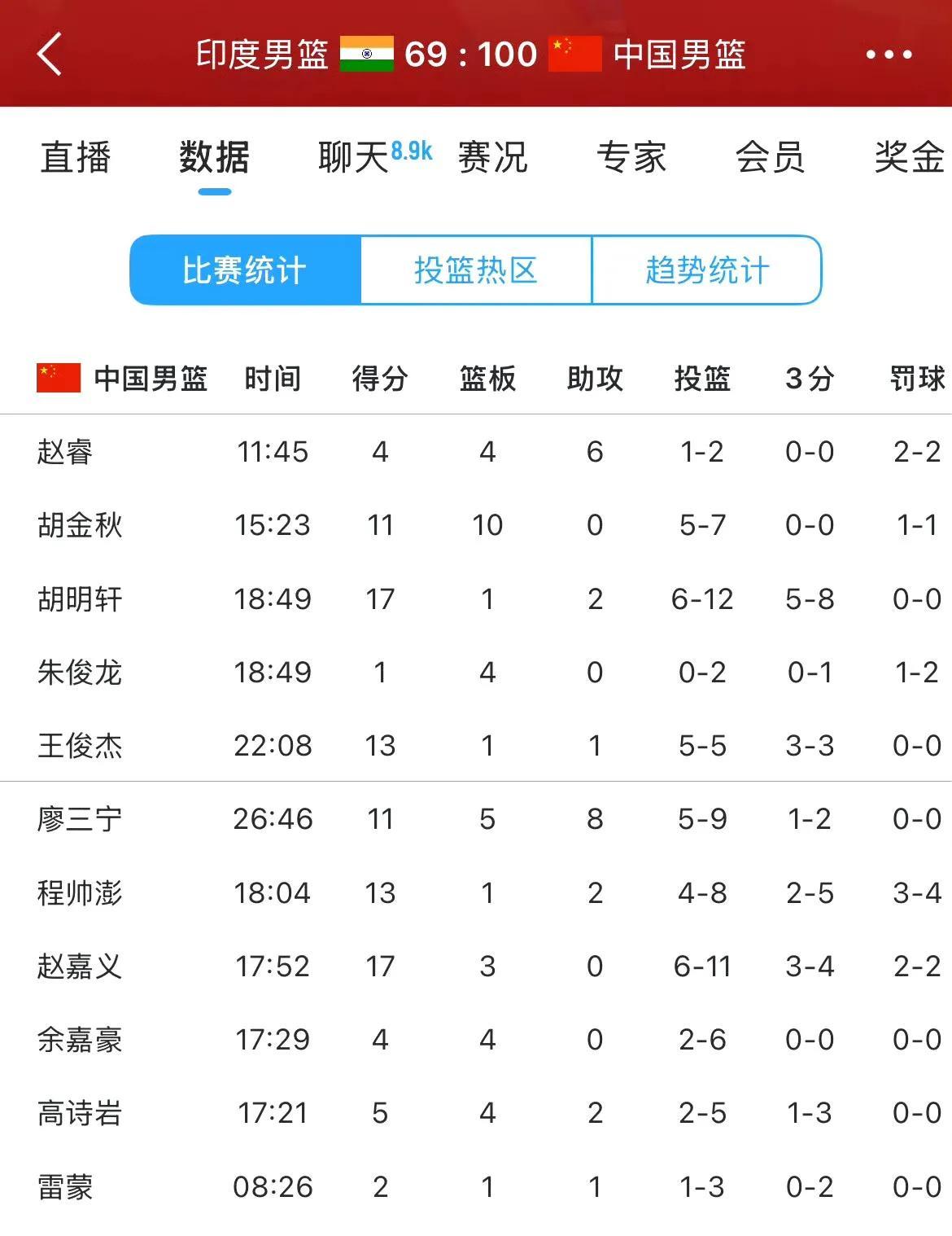 亚洲杯小组赛第二场,男篮100-69赢了印度31分。 比赛没有什么可参考价值,王