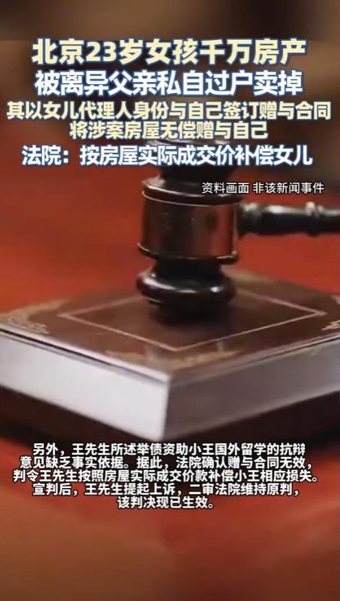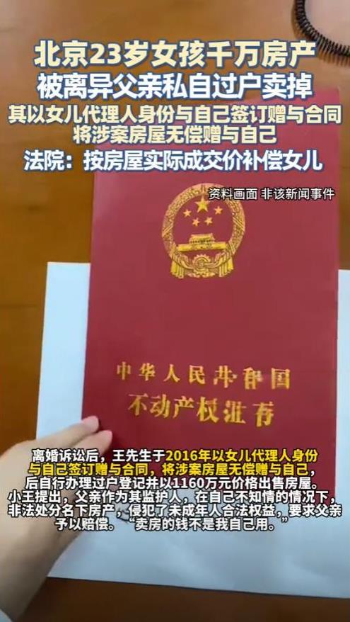 “太不要脸了!”北京,一父亲私自将未成年女儿的房屋,过户到自己名下并将其出售,声称售卖房屋的钱,被用于女儿身上,然而,该行为却没有经过女儿母亲,以及女儿本人的意愿,对此法院给出判决! 千万房产不翼而飞? 根据新京报8月7日报道,2023年,王粒前往不动产登记中心办理手续时,发现自己名下那套价值千万的房产,竟在2016年8月就被过户并售出。 更让她无法接受的是,操作这一切的竟是自己的亲生父亲王先生。 2007年,王先生与张女士的婚姻尚在存续期间,他们以刚满5岁的女儿王粒名义购买了一套房产,这套房子从登记之日起,法律上就明确属于王粒的个人财产。 然而,在2016年,王先生与张女士的婚姻走到尽头,法院判决书再次确认,案涉房屋系王粒个人财产,不属于夫妻共同财产范围,因此未在离婚财产分割中予以处理。 王粒的抚养权被判给了父亲王先生,但是就在离婚判决后短短数日内,王先生做出了一系列令人瞠目的操作。 他以法定监护人身份,同时扮演两个法律角色:既是赠与人王粒的“代理人”,又是受赠人本人,将女儿名下的房产无偿“赠予”自己,并以1160万元的价格将房子出售给案外人。整个过程中,王粒毫不知情。 2023年,已成年的王粒将父亲告上法庭,要求确认赠与合同无效,并索赔1160万元损失。法庭上,父女各执一词,展开激烈交锋。 王先生辩解称,卖房是“为了女儿的利益”,声称售房款主要用于女儿留学开支,并强调自己因离婚后财产纠纷,需向前妻支付款项,迫不得已才出售房产获取资金。 然而,张女士当庭揭穿了前夫的谎言:“刚离婚就办过户,几天时间就把房子卖了。”所谓“为女儿利益”完全不符合事实,是赤裸裸的侵害未成年人财产权益。 案件审理过程中,法官仔细审查了王先生名下财产状况,发现其所谓资助女儿留学的说法毫无证据支持。从离婚到卖房的时间点、资金流向等多方面分析,王先生的辩解都站不住脚。 法院判决书明确指出,王先生的赠与行为在法律上构成“自己代理”,即代理人代理被代理人与自己实施法律行为。这种行为的本质是监护人以监护之名,行转移被监护人财产之实。 “监护人应当按照最有利于被监护人的原则履行监护职责。监护人除为维护被监护人利益外,不得处分被监护人的财产。”法官强调王先生的行为,完全违背了法律规定的基本原则。 更严重的是,王先生在处分女儿千万财产时,既未征求当时已14岁的王粒本人意见,也未尊重其真实意愿,严重侵害未成年人财产权益,且有悖公序良俗。 法院最终判决:确认王先生自行签署的赠与合同无效;王先生赔偿王粒房屋出售价款损失1160万元。王先生不服上诉,但二审法院维持原判,目前该判决已生效。 法律界人士强调,法院在处理此类案件时,面临双重任务:既要充分保障未成年人权益,又要防止未成年人父母恶意反悔,滥用“处分未成年人财产无效”的法律规定,违背诚信原则损害交易相对方权益。 正如本案法官警示:“监护人在履行监护职责时,应按照最有利于被监护人的、尊重被监护人真实意愿的原则进行,否则不仅将导致法律行为无效,更可能导致自身监护权的丧失。” 此事曝光之后,有网友在评论区留言:“离婚后几天就办过户,这父亲吃相太难看!还好法院主持公道。” 法律界人士对此案评价道:当房产证上写着孩子的名字时,父母要明白,那不再是一张可以随意处置的家庭票据,而是受法律特别保护的未成年人财产边界。 信息来源于:新京报 2025年8月7日 《父亲私自将未成年女儿房屋过户至自己名下并出售,法院判赔千万元》