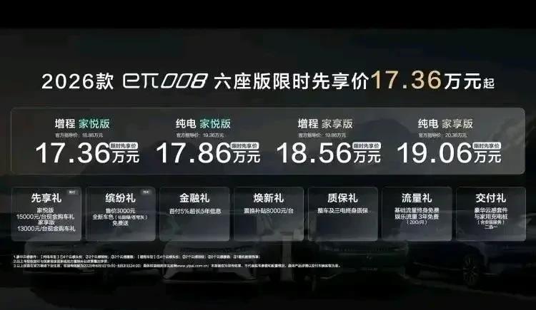 当国人都以为问界M7、理想L6、比亚迪唐DM是15~20万级主流家用SUV的佼佼者时,万万没想到!东风汽车26款eπ0086六座版强势来袭—— 8月31日前下定,还可享置换补贴、整车及三电终身质保等7重好礼,更有3年免费保养等,性价比拉满! 26款eπ0086六座版,提供纯电和增程两种选择。纯电版CLTC续航620km,增程版综合续航1220km。15分钟就能从30%充至80%,日常通勤和长途旅行,都不在话下。 17.36万起的售价,却标配着同级车高配才有的“冰箱+彩电+大沙发”。直接把舒适配置拉满,让“花小钱享高配”成了家庭用户的触手可及的福利。 全系标配高通骁龙SA8295P芯片,车机系统基于东风全栈自研“太极大模型”,真正做到“想说就说,秒懂秒答”,15.6英寸2.5K后排高清娱乐屏,S0A天元智驾,豪华又科技感十足。 拥有“超大空间+舒适体验”的26款eπ008,无论从静态、动态还是智能维度都优化升级,全方位诠释着对舒适的极度追求。 #26款eπ008六座版上市#