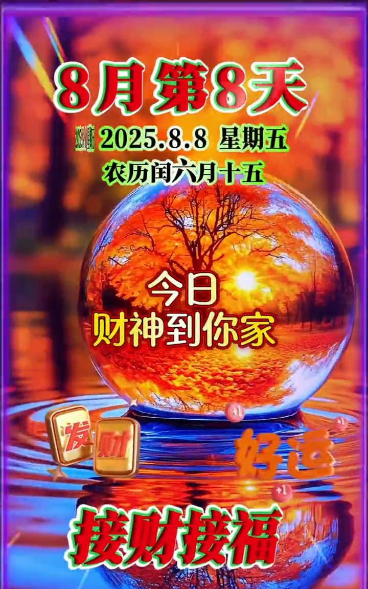 8月第8天,2025.8.8星期五,农历闰六月十五。 今天是8月8日星期五,千万别错过今天这个双份幸运发财日,888发发发。今日财神到你家,接福接财接好运,顺风顺水事事顺。愿你家人健康平安,生活幸福美满,工作顺顺利利,爱情甜甜蜜蜜,人生十全十美,快乐长长久久。早安!