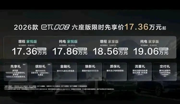 不但雷军没想到,销售大王王传福也没想到,就连发文称尊界S800大定已超过5000台的余承东更万万想不到—— 2026款eπ008六座版上市,真是实惠多多,其中包括8月31号前的限时先享价1.5万元、首付5%超长5年低息金融礼、置换补贴礼8000元,还有充电桩/套件二选一交付礼、整车及三电终身质保等等。 当然说一千道一万,安全性和舒适度才是头等重要。不过2026款eπ008六座版拥有70.8%高强钢车身+1500MPa门环结构,外加全系6气囊覆盖三排。电池通过超国标5倍安全测试,10年30万公里质保承诺。 尤其主动安全系统集成AEB自动紧急制动、全速域自适应巡航、车道居中保持等24项功能,毫米波雷达与摄像头融合感知可识别150米内障碍物 ,确保一路畅通无忧。 至于舒适度,2026款eπ008六座版更是交出满意答卷。专业团队调校底盘,过减速带、坑洼路如履平地。全系标配“冰箱+彩电+大沙发”——冰箱存母乳、零食,车机秒播动画片,二排座椅秒变“移动儿童乐园”。 毫不夸张地说,2026 款东风奕派 e π 008 六座版在 “ 舒心品质、 舒心科技、 舒心驾控、 舒心守护” 四大维度全面升级,限时先享价 17.36 万元起,为用户带来极具诱惑力的超值选择。 从车身空间的“家庭扩容”,到动力续航的“安心兜底”,从操控安全的“隐形守护”,到价格权益的“暖心让利”,2026款东风奕派eπ008六座版重新定义了家庭用车的“舒适标准”,成为家庭出行的“全能伙伴”。 #26款eπ008六座版上市#