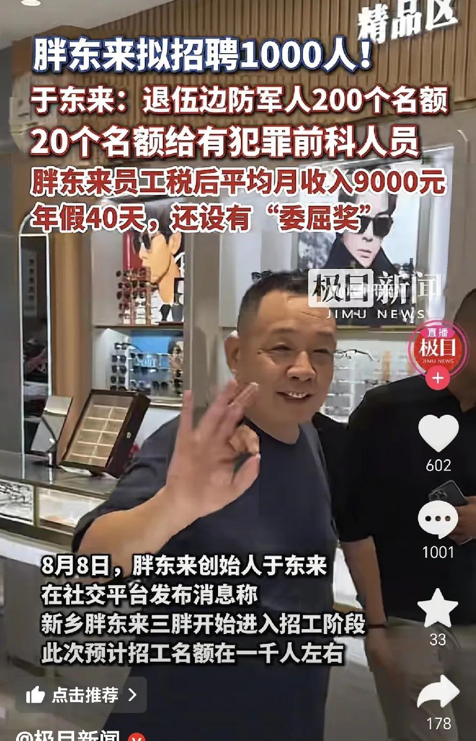 #分享城市新鲜事# 要说有社会良知的企业,胖东来算是一个了。 新乡的胖东来准备开业,这次准备招1000多名员工。而且招聘给出的要求是,200名名额给边防军人,20名名额给有犯罪前科的人。 这则招聘条件,可以说于东来这人,胸怀广阔,对社会责任感还是有的。 退伍军人可以理解,有犯罪前科的人,你是真大义,这些人很多会再次犯罪,就是因为找不到工作,被社会歧视,你在某种程度上给了他们一次重生的机会,这个也只有胖东来企业开了一个好头。[赞][赞][赞]