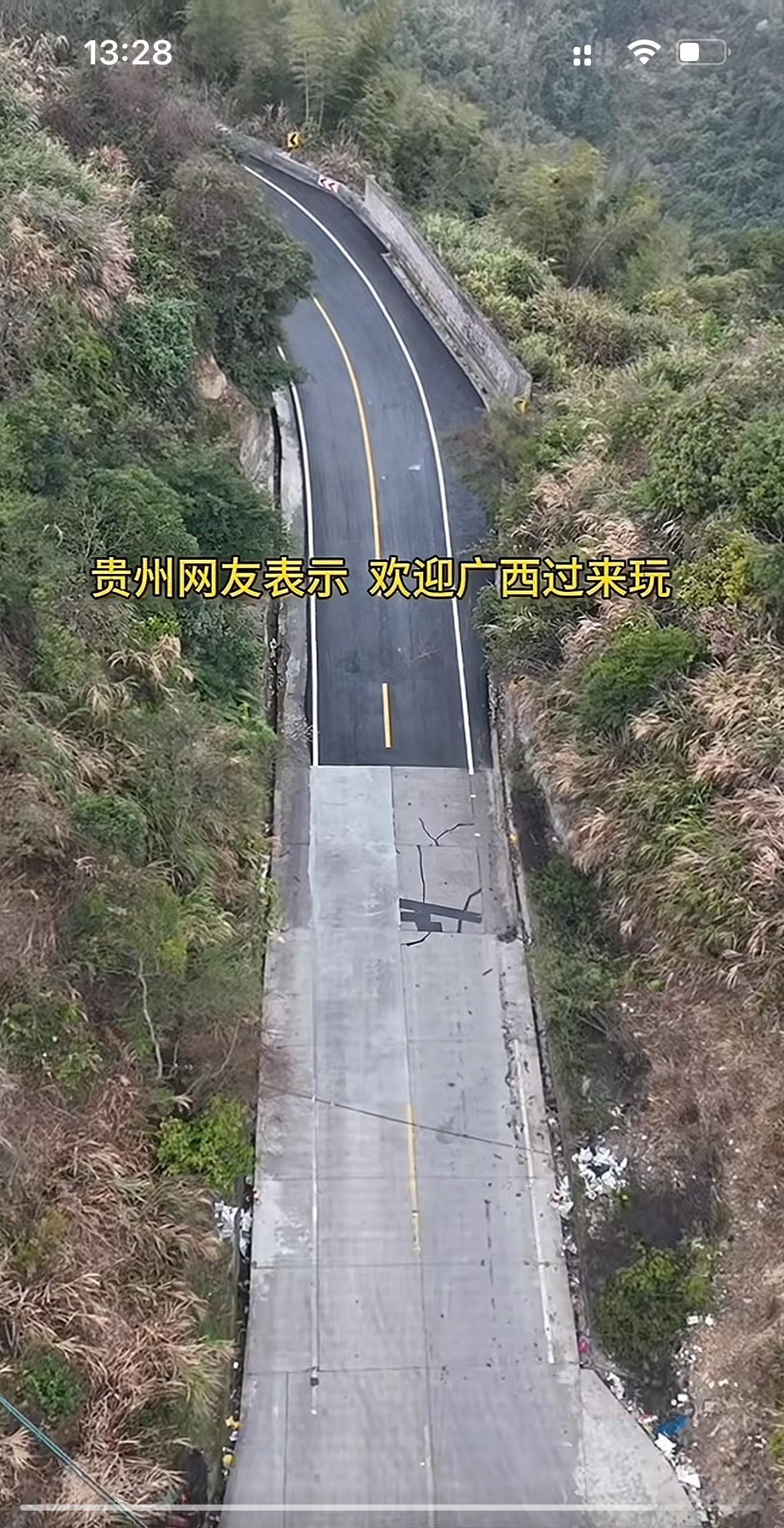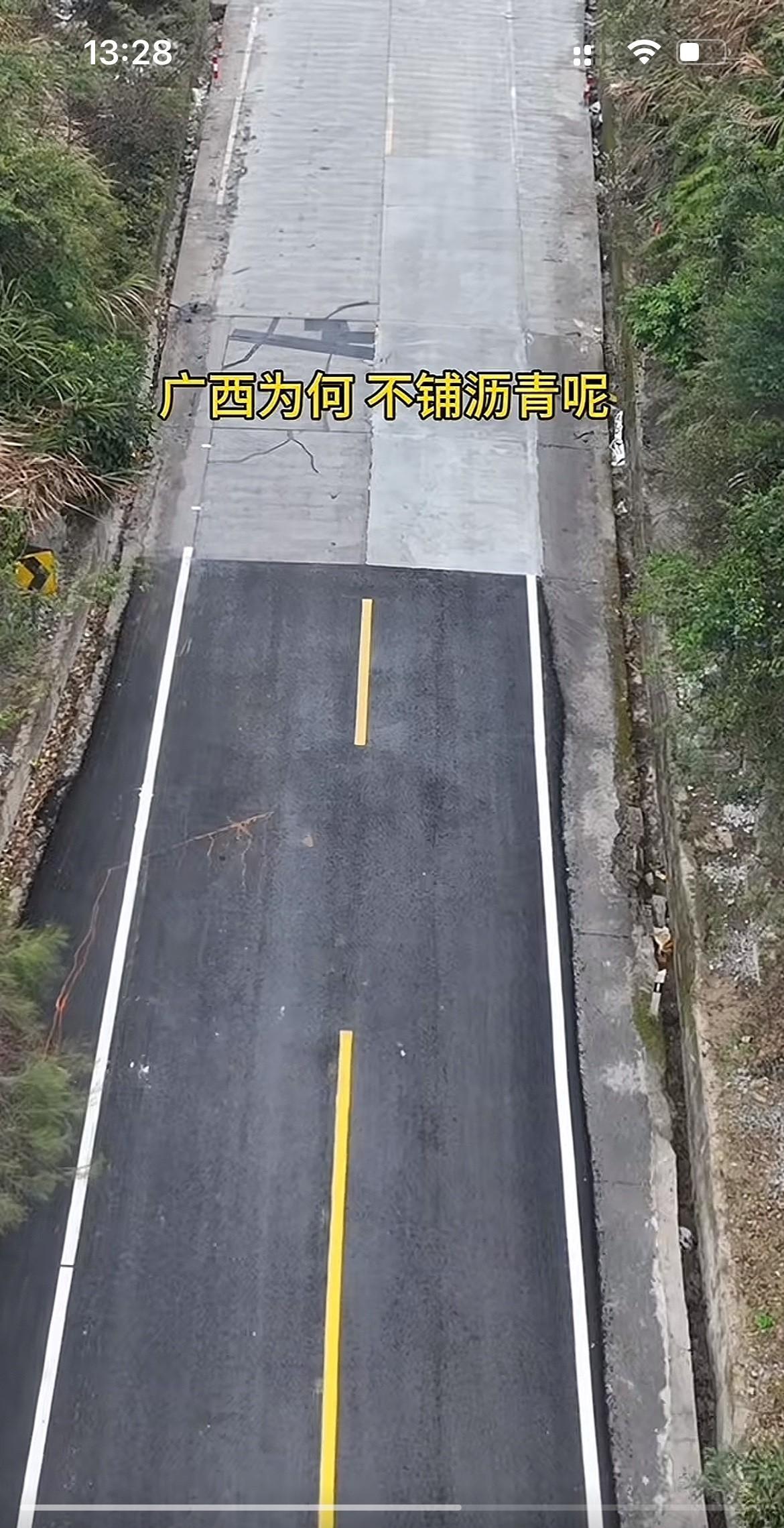 广西和贵州交界处,贵州这边是沥青路面,广西那边是水泥路面,两个山区穷省这样看贵州更富裕一些。