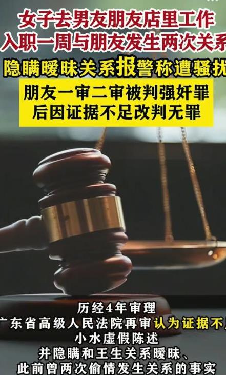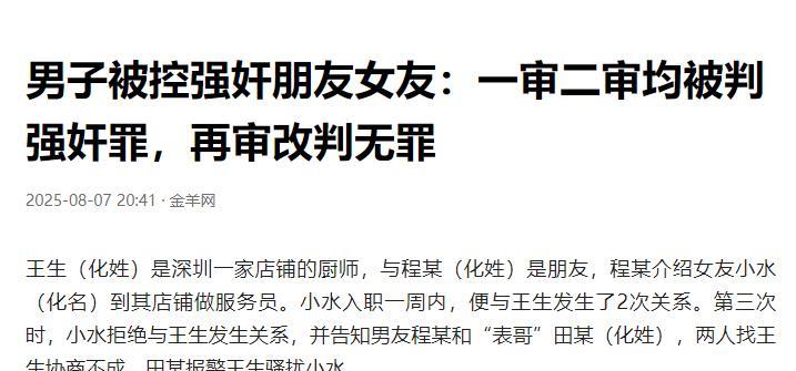 广东深圳,男子和朋友的女友发生了2次关系,第三次时,对方反抗,男子离开,可没想到,对方索赔无果后,报了警,男子因犯强奸罪被判刑10个月,男子不服,认为自己无罪,高院再审给出了不一样的看法。 据金羊网8月7日发布,程先生(化名)的女友小琪(化名)最近忙着找工作,程先生看着女友着急,也跟着操碎了心。 2021年6月23日,程先生的朋友王某(化名)约他出去吃饭聚一聚,程先生带上女友一起,到了饭店,几人边喝酒边聊天,程先生无意中提出女友要在这边找个工作干,好巧不巧,王某说正好最近他们餐馆在招一名服务员,可以小琪来试试。 王某是餐馆的厨师,在餐馆已经干了好几年了,业务和流程十分熟悉,和老板也熟悉,王某还说店里老板和老板娘都很和善,而且平时工作也不是很累,比较适合女生。 小琪一听,表示自己可以去那里干干试试,毕竟刚来这边人生地不熟的,有个认识的人一起工作也可以相互照应。于是,在男友的建议下,双方互加了微信,之后,王某就介绍小琪到他任职的店铺做服务员。 谁也没想到,就是简单地找个工作,事情会发展成后面那副模样。 2021年7月13日,小琪入职。结果还没到一周,她发现平时王某很是关照他,帮她干这干那,而且总是关心她,渐渐地俩人关系有些微妙,结果没几天,小琪就背着男友程先生,和王某发生了两次关系 ,这两次,都是你情我愿的。 可第三次的时候,情况变了。2021年7月23日凌晨,王某找到小琪,再提出那事儿,小琪明确拒绝,还反抗了。王某看这架势,也没强求,就离开了。本以为这事儿就这么翻篇了,结果小琪转头就把这事儿告诉了男朋友程先生,还叫上所谓的 “表哥” 田先生(化名)。 这俩人一听,当日,程先生和田先生来到烧烤店与王某协商,王某未予以理会,他觉得小琪是自愿的,他并没有任何强迫。随后田先生脾气上来了,以朋友受到骚扰报警,这事儿就这么闹到了派出所。 紧接着,司法程序启动。王某怎么也没想到,自己会被卷进强奸罪的旋涡里。2021年11月,一审法院判了他强奸罪,有期徒刑十个月 。 王某觉得冤啊,自己明明没强迫,前两次都是自愿的,第三次被拒也走了,怎么就成强行发生关系了?他不服,一直上诉,2022年3月,法院二审维持原判。 但王某还是不服气,于是还是一直上诉。再审的时候,情况大反转。法院一查,发现小琪在陈述的时候,藏了不少事儿。她没说前两次和王某是自愿发生关系的,把这暧昧的事儿给瞒下来了,就说自己是被骚扰。 这证据链一断,问题就出来了。高院再审认为,现有证据不足以证明王某是强行发生的,而且小小琪有虚假陈述的情况。 2025年7月,广东省高院终审撤销原判,最后改判王某无罪 。 这几年,王某的人生就因为这事儿被搅得稀碎,工作没了,名声也坏了,就等着一个清白。 这事儿在网上一传开,网友们炸开了锅。有人说,“这小琪也太不地道了,两次自愿,第三次反悔就算了,还藏着掖着,差点把人一辈子毁了。这也给所有人提了个醒,谈恋爱也好,交朋友也罢,别稀里糊涂的,真出事儿了,说不清。” 也有人感慨,“司法这玩意儿,还真得严谨,证据不足就不能乱定罪,不然好人也得被冤枉” 。 对此你怎么看?欢迎大家在评论区留言讨论。 信息来源:金羊网 发布于2025年8月7日