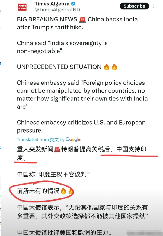 印度媒体感到很震惊!印度媒体表示,在美国欺凌印度之际,中国表态支持印度!8月7日,根据印媒报道,印媒称,在特朗普提高关税后,中国支持印度。中国大使馆表示:一个国家的外交政策的选择不能被任何其他国家操纵,不管他们自己宣称这与印度具有多大的关联。印媒表示,当美欧对印度购买俄罗斯能源进行施压时,中国批评了美国和欧洲。