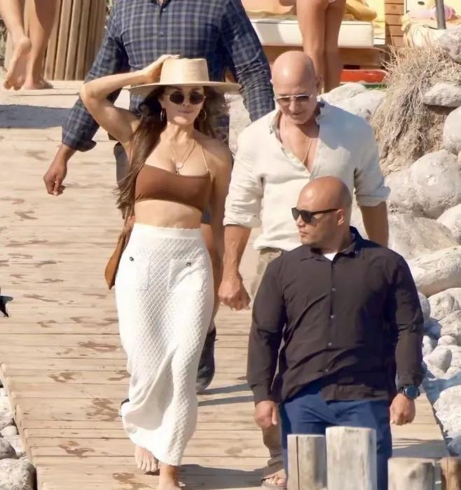 贝佐斯与新婚妻子桑切斯同游度假,二人状态出众,恩爱尽显。桑切斯身着土黄色抹胸搭配