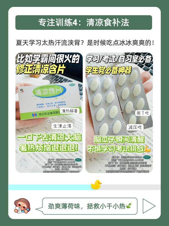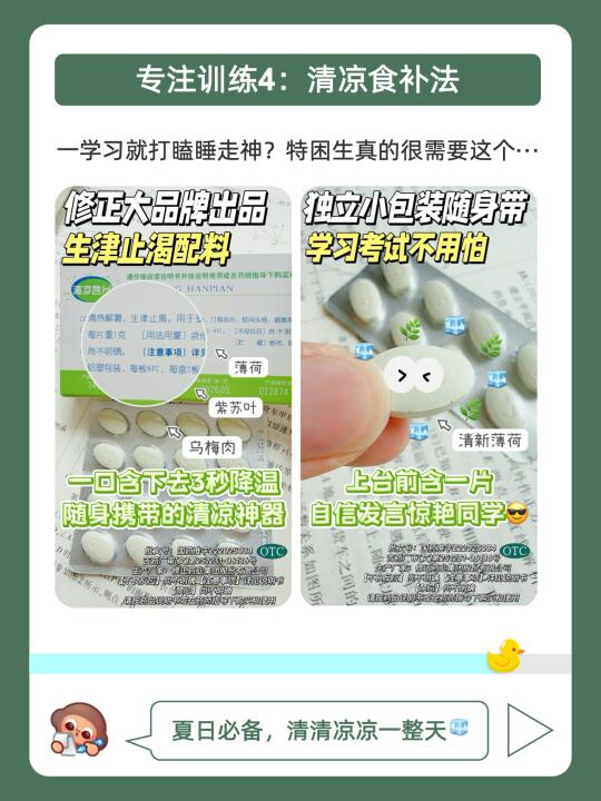 夏天太热了学习困倦乏力没精神?咱们可以试试修正清凉含片,不含糖的清新薄荷,冰凉的口感惹人爱!独立小包装,随身携带,随时来一片,自信发言。