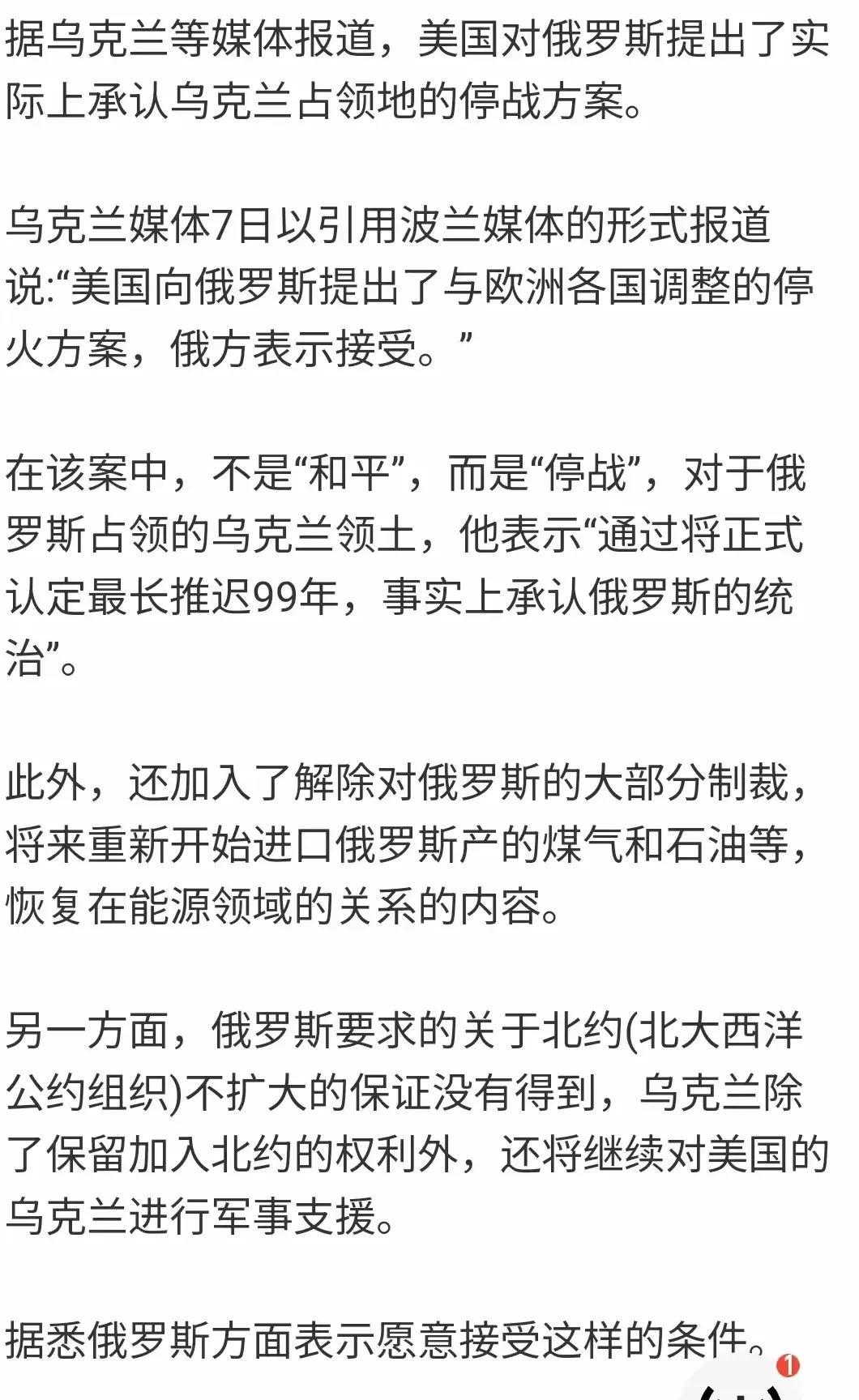 小编胡说八道,据波兰媒体透露的美国特使交给普京的停火方案是:1,美国承认克里米亚和乌东四州属于俄罗斯,其他被俄罗斯控制的乌克兰地区也属于俄罗斯2,乌克兰永远不能加入北约3,美国将解除对俄罗斯的大部分制裁,恢复俄美贸易。