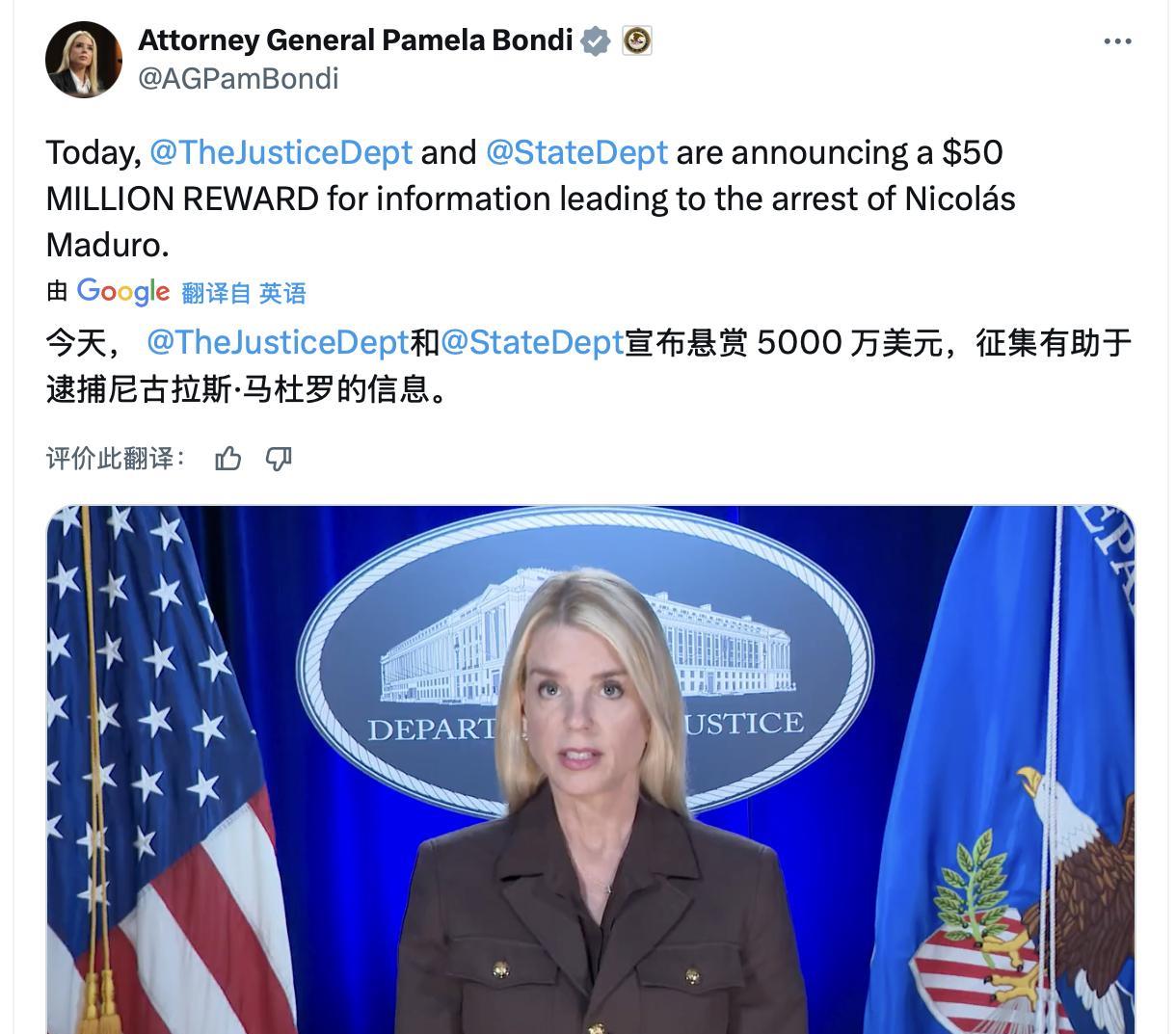 美国将逮捕委内瑞拉总统马杜罗的悬赏金额提高至5000万美元! 在发布到X平台上的一段视频中,美国司法部长帕姆·邦迪(Pam Bondi)指出:马杜罗与“太阳卡特尔”(Cártel de los Soles)、阿拉瓜帮(Tren de Aragua)以及墨西哥锡那罗亚贩毒集团有关联,并指控其支持往美国输送掺了芬太尼的可卡因,是全球最严重的“毒枭之一”。 委内瑞拉总统马杜罗在 2020 年被美国曼哈顿联邦法院起诉,指控其领导国家级的“贩毒-恐怖主义”(narco-terrorism)网络,涉嫌将芬太尼污染的可卡因大量输送入美,对民众健康构成严重威胁 。至今 DEA 已没收数十吨与其网络有关的毒品,检方还查封了飞机、豪车等资产、估值上亿美元。 2020年,特朗普首次指控马杜罗“毒品恐怖主义”,悬赏1500万美元。 2024年委内瑞拉选举被美国认定为舞弊,拜登政府不承认马杜罗连任合法性,支持反对派人士贡萨雷斯为真正总统,并把悬赏从最初的 1500万美元逐步加码到 2500 万(等同本·拉登赏金),再到如今的 5000 万美元。 而委内瑞拉外长伊万·吉尔(Yvan Gil)斥责悬赏为“可悲的政治宣传”,称“国家尊严非卖品”,并反指美国策划恐怖阴谋。并且否认选举舞弊与贩毒指控,强调美国意图颠覆合法政府。 美国为什么加大力度追缉马杜罗?表面看是打击跨国毒枭,但实际是地缘政治颠覆的标准化操作,其核心目标有三: 1、终结美洲最后一个反美左翼政权,重塑“门罗主义”权威; 2、夺取石油资源主导权,切断中俄战略渗透; 3、转移国内毒品危机责任,服务选举政治叙事。