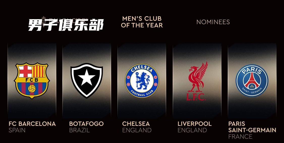 最新:《法国足球》公布了2025年金球奖最佳男子足球俱乐部、女子足球俱乐部提名: