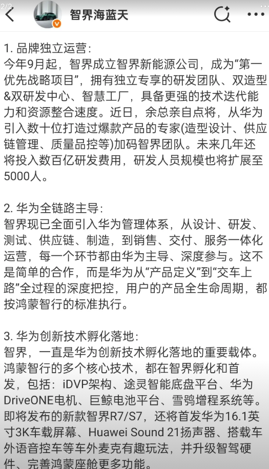 没有退路,华为从奇瑞手中接管智界? 才刚刚官宣,奇瑞与华为的合作便再度升级,智界汽车成立了新公司,由华为全链路主导。按照智界产品总监海蓝天的说法,智界才是“纯血鸿蒙智行”:引入华为的产品专家、引入华为的管理体系、落地华为的创新技术……研发人员也扩充到了5000人! 这回决心不小,看来余承东是真想把智界做起来了。这个态度,和华为自己造车没区别了。