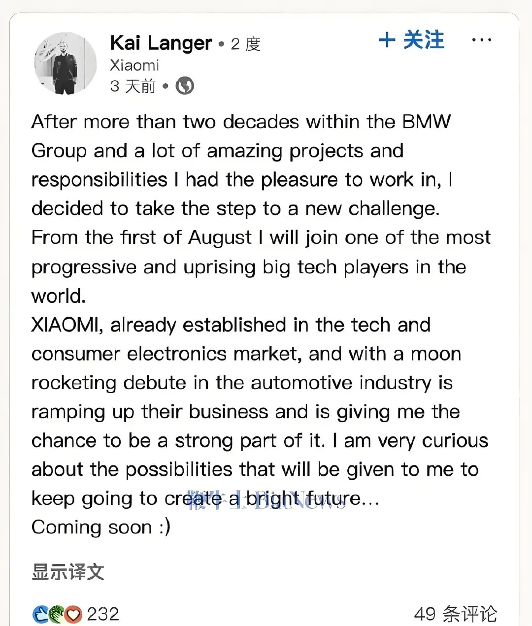 还在吐槽小米汽车没辨识度?说 SU7 像这像那?路上开过去不看标认不出? 雷军直接扔出王炸 —— 宝马 i 系列设计灵魂人物 Kai Langer 带着 20 年豪华车功底跳槽来了! Kai Langer 可不是等闲之辈!从 2003 年就在宝马深耕,亲手操刀了划时代的 i3(全球首款碳纤维量产车)和超跑 i8,后来的 i4 更是在纯电车上玩出运动范儿, Langer 最擅长 "情感化设计",能让车有 "灵魂"—— 曲面屏、水晶控件、隐藏传感器这些宝马经典元素。 这波跳槽根本不是偶然!传统车企的顶流设计师用脚投票,说明啥?宝马这些传统豪门,电动化转型磨磨唧唧,i 系列销量拉垮,设计团队来回折腾,连自己的灵魂设计师都留不住。