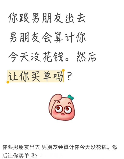 你跟男朋友出去 男朋友会算计你今天没花钱。然后让你买单吗? ​​​
