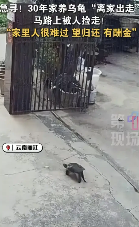 8月6日,丽江市永胜县。女子晒视频称,自己养了30年的鳄龟离家出走,走到马路上被白色车主捡走装进后备箱,然后开走了。母亲比较难过,希望能够联系到车主,看下能不能归还,必有酬谢。