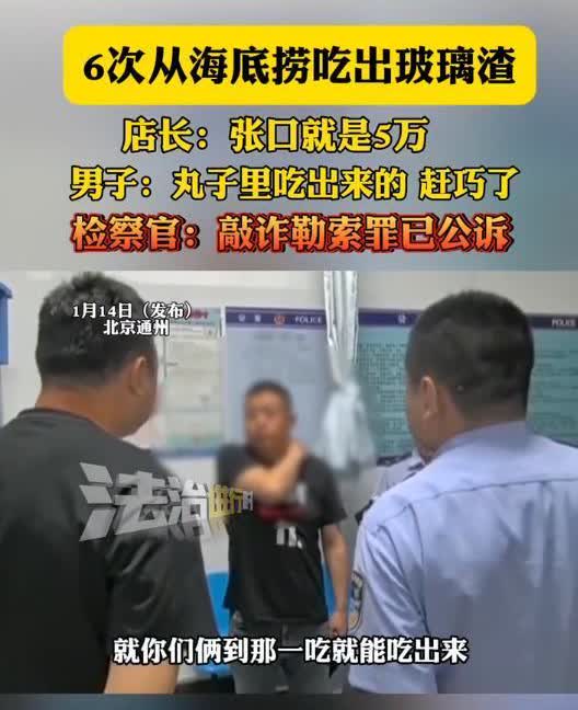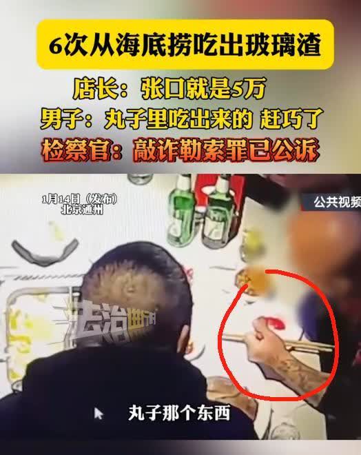 北京,一男子口含玻璃渣,6次到海底捞吃火锅,谁知,刚夹起一颗牛肉丸,却喷在盘子上一大口血。男子找店长索要5万元赔偿,店长的做法让人一阵咋舌!警方:男子已刑拘! 在北京的一家海底捞火锅店,有个男的说他吃牛肉丸时吃到了玻璃渣,然后立马就吐了血水,接着就开口要很大一笔赔偿。但这可不是什么巧合,而是他们事先计划好的骗局。 这个男的,咱们就叫他小朱吧,他跟朋友在海底捞吃火锅时,突然说牛肉丸里有玻璃碴,还当场吐了血,张口就要店家赔5万块钱。店长虽然没法证明食材没问题,但怕事情闹大影响不好,最后还是赔了小朱8000多块。不过店长心里总觉得不对劲,后来就去报了警。 警察一查,发现小朱他们之前已经在好多地方用同样的方法“吃出”玻璃渣,骗了好几万块钱。监控视频里看得清清楚楚,他们两个从厕所回来,牛肉丸还没咬呢,血就吐出来了,明显是装的。警察一问,他们俩也说不清为啥总能在海底捞的牛肉丸里“吃出”玻璃碴,这明显就是敲诈勒索嘛。 最后,小朱和他朋友因为敲诈勒索被警察抓了起来,案子也交到检察院准备起诉了,他们俩这回可是要受到法律的严厉惩罚了。