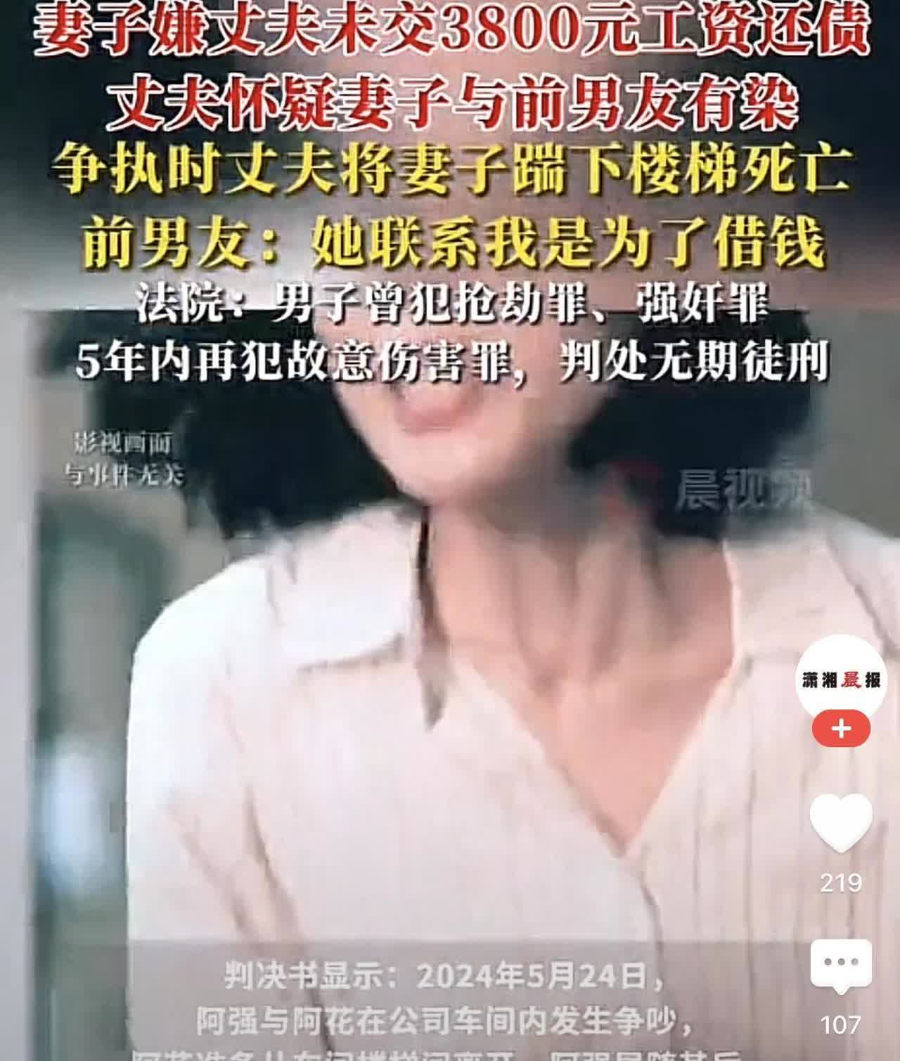 浙江金华,男子刚发了一个月的工资3800元,结果就被妻子讨要,两人因此在供公司车间发生了争执,男子怀疑妻子和前男友有染,于是便将其一脚踹下楼,最终妻子抢救无效去世,事发后,男子却只被判了无期。 在浙江金华,有这么一对夫妻,因为怎么花工资这事儿大吵了起来,最后还闹出了人命。阿强这个老公,一气之下把老婆阿花从楼梯上踹了下去,结果阿花就这么没了。这事儿啊,其实就是家庭里那些矛盾、互不信任,再加上暴力闹的。 说起来,阿强以前还犯过事儿,坐过牢。可阿花呢,对他一直没放弃,两人一起在工厂打工过日子。发工资那天,阿强拿了3800块钱,本想给自己买点好的,结果阿花说要拿去还债。阿强心里就不乐意了,怀疑阿花拿着钱去找前男友。两个人越吵越凶,阿强一上头,就把阿花踹下了楼梯。阿花一头磕在地上,当时就晕过去了,送到医院也没救回来。 后来阿花的前男友出来说话了,说他俩早就分手了,不过因为阿花欠了债,他前前后后帮她还了十多万,案发前还借了9000块给她,结果月底就被拉黑了。阿强呢,因为有前科,这次被判了无期徒刑。法院说,他这是故意伤害,还是再犯,得从重处罚。一个家庭因为互相猜疑,最后落得一个人死了,另一个人进了监狱,这给两家都带来了永远治不好的伤心和沉重的法律惩罚。
