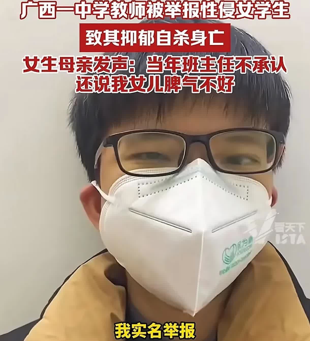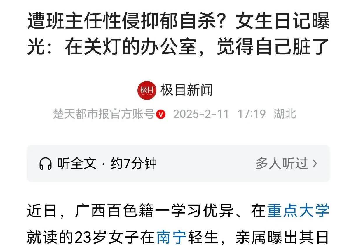 广西百色,女子半夜回家,发现女儿房间门窗紧闭,敲门无人应答,报警后,进入房间,发现女儿已经没了呼吸。女子整理女儿遗物,发现女儿在日记中记下的秘密:高一时曾被班主任叫去办公室性侵,觉得自己很脏。女子崩溃:高二时女儿曾告诉自己,班主任老师以补课为名对她进行性侵,自己想要报警,因没有足够证据,加上女儿还要继续学习,放弃了。 在广西百色,有位妈妈深夜里回家,发现女儿房间关得紧紧的,一点声音都没有。她心里一紧,赶紧报了警。警察来了打开门一看,女儿已经不在了。在收拾女儿东西的时候,妈妈发现了一本日记,里面写满了女儿这些年来的痛苦。 谁能想到,那个以前全县第一考上好高中的女孩小符,竟然会选择在花儿一样的年纪离开。2019年,小符哭着回家说,班主任唐老师借着补课的名义欺负了她。妈妈听了火冒三丈,可是因为没有足够的证据,又怕影响女儿的学业,最后还是选择了忍气吞声。从那以后,小符就像变了个人似的,成绩也下滑了,还得了抑郁症。高考前,她竟然把准考证给撕了,复读一年考上了上海的好大学,结果又因为病情太重休学了。在大学里,她好不容易鼓起勇气在同学群里说了这件事,结果却被唐老师反咬一口,群聊也给解散了,她的心又被狠狠地伤了一次。 到了2025年1月17日,这位妈妈上完夜班回家,发现女儿房间还是关着,敲门也没人应。报警后,大家破门而入,只看到炭火还没灭,小符已经走了。在日记里,小符写下了自己早在高一,也就是15岁那年,就在唐老师的办公室里被欺负的事情。她说:“我觉得自己已经不干净了。”这三年的高中生活,对她来说就像地狱一样,怎么也走不出来。 妈妈心如刀绞,决定站出来实名举报。现在,唐老师已经被停职了,调查也正在进行中。我们相信,真相总会大白于天下的,正义虽然有时候会迟到,但它永远不会缺席。