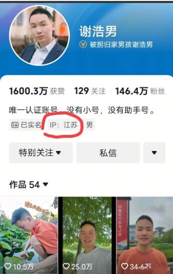 谢浩男都回来8天了,他的账号居然都没更新过,他只出现在他爸妈和大妹的视频里。而且他账号的IP地址也还在江苏,这也说明了谢浩男不经常刷某音,可能是个不沉迷手机的人。明天早上9点他妈妈许健华就要带货了,谢浩男也没在账号上宣传一下,怪不得那些粉丝这么喜欢他。
