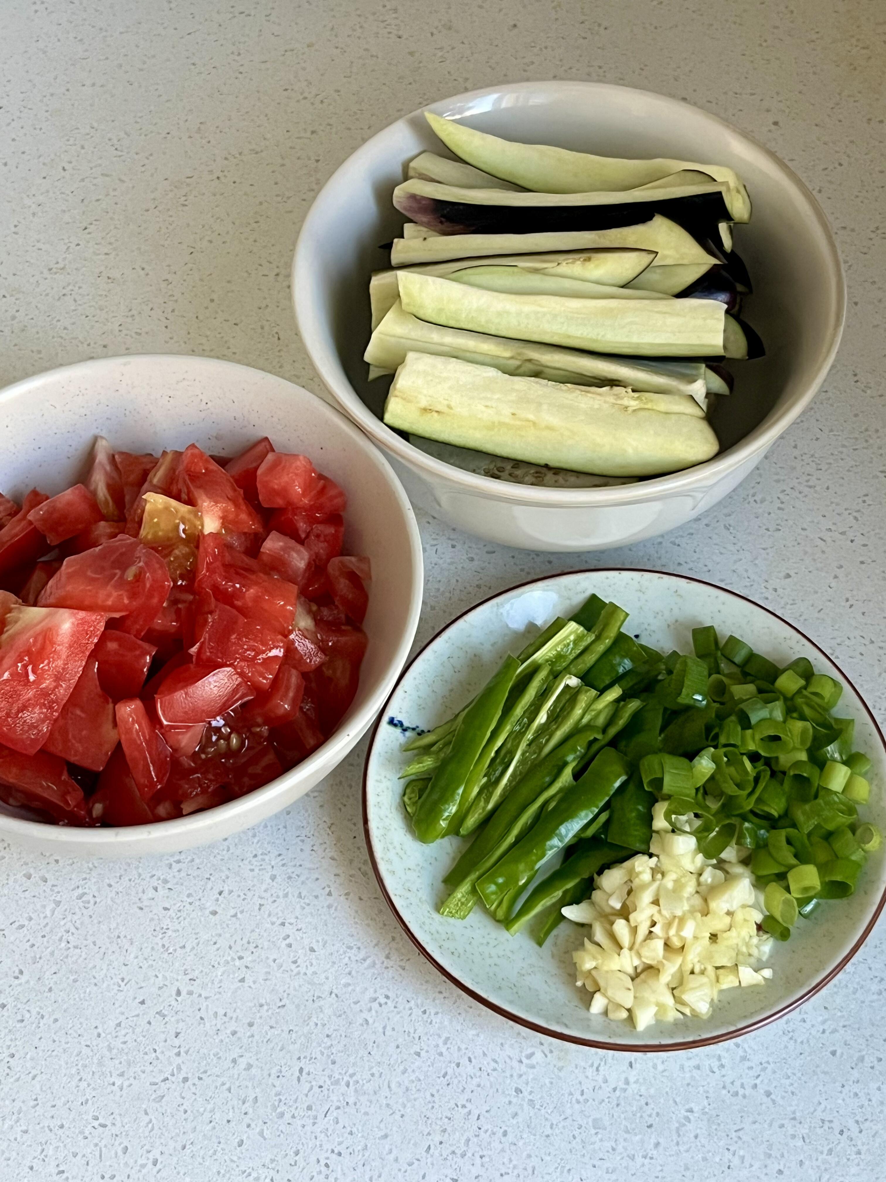 制作这碗茄辣西,第一步,把茄子、尖椒统统切成条,再剁点蒜末,番茄切成小块放一旁备用。 切好的茄条别急着下锅,找个碗,倒入清水,加一勺盐,把茄条丢进去泡上五分钟。时间一到,捞出来用清水冲洗干净,再把水分转干。 接下来,热锅倒油,把茄条放进去煎熟,盛出来放一边。锅里再留点底油,爆香蒜末,紧接着把番茄倒进去,一顿翻炒,直到炒出红痧。 这时候,把尖椒和煎好的茄条一股脑儿倒进锅里,开始调味,加一勺鸡精、一勺糖、一勺蚝油、一勺生抽,再倒点适量的水,稍微焖上两分钟。 等汤汁收得差不多了,淋上水淀粉勾个芡,最后撒上一把小葱,这碗香喷喷的茄辣西就大功告成啦!
