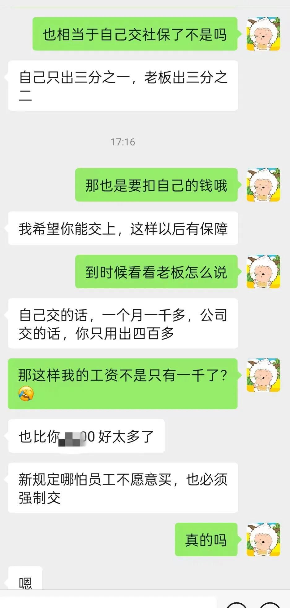 真的要强制交社保了吗? 今天下午,一位大哥发信息给我,说从9月份开始,所有的公司都强 制交社保了。 当时一看到大哥这句话,我就想起了前两天看到的评论,前两天有一个网友说以后都要强 制交社保了,不过当时我没太把这句话放在心上,因为我觉得这是不太可能的事。 但是大哥这句话,却让我很相信,因为这个大哥在我心里是一个很敬重的人,平常我有什么不懂的,我都会发信息给这个大哥,然后他都会给我很合理的建议与鼓励。 所以当看到大哥的这句话,我还是很激动的,为什么呢? 因为我今年32岁了,从我15岁出来打工到现在,我从未交过社保,我根本都不知道社保是什么,如果说从9月份就强 制交社保的话,那对于像我这样的农村妇女来说,真的是一个很好的选择。 然后大哥又告诉我,现在的新规定就是如果老板不帮员工交社保,那是要吃家里以外的饭的。 当时一看到大哥这句话,我又不知道该如何回他了 ,为什么这么说呢? 因为我的老板有着十几家托管,然后员工加起来可能也有几十个吧,但是我听那些老员工说过,老板从来没有帮任何人交过社保,所以更别说像我们这种只做半天的兼职了。 虽然大哥说9月份开始会强 制交社保,但是以我对老板的了解,他肯定不会帮我们交社保的,但同时他也会让我们不要嚷嚷这些事,到时候他可能会说交社保就相当于减少了工资,然后我们这些人都是打工的,肯定都想拿到一个月正常的工资,老板可能就是摸准我们这一点,到时候可能就不会帮交。 那么今天我也跟大哥聊了很多,我说我的工资就1500,如果我交社保的话,那可能一个月到手的工资就只有1000了。 大哥说社保不是这样算的,就是公司帮交2/3,然后个人出1/3,就算拿到手的工资只有1000块,那也比一个月拿1500的工资强,因为有社保了。 那说实话,我确实从来没有交过社保,然后大哥今天说的那番话也确实让我很激动,如果说老板以后帮忙交社保的话,那我也是有社保的人了,以后就算再去找其他工作,那也都是等退休了会有退休金。 交了社保以后,等到了退休的年纪,就有退休金,这个道理我是知道的。 但是以我对老板的了解,应该不会帮忙交的,那可能就会有人说了,可以去举报什么的。 但是老板也不傻,老板肯定会说交社保的话,那么一个月到手就只有1000块,那到底是宁愿要1000块,还是宁愿要1500呢? 可能大部分人会愿意要交社保,但是买的没有卖的精,我觉得社保这件事很难说。 那话又说回来,今年我的小孩也要上一年级了,然后我也32岁了,我不知道未来还有多少年,有可能我的未来只有二三十年,但也有可能我的未来有五六十年,所以我是这样想的,先干这一份工作有个过渡期。 然后等孩子长大一点了,就比如上三四年级了,那时候就可以自己放学回家,自己吃饭写作业了,到时我再找那种帮忙交社保的工作,因为也要60岁才退休嘛(我不知道是55岁还是60岁)所以我想着在40岁之前,找一份帮忙交社保的工作。 我的心里真是这样想的,但是我又不好意思说出来。 但说真的,我也是羡慕那些已经交了社保的人,因为等他们退休后就有退休金了,然后我现在也32岁了,现在我主要是以考虑孩子为主,但是等孩子长大一点,就是当我40岁了,然后我也没说再想生三胎的打算,到我40岁了,我就过自己想过的生活,找一份交社保的工作,等到60岁了,我也就能领退休金了。 准备9月了,到时候我也要上班了,真希望老板那时能给我们这些员工交社保,哪怕一个月只领1000块钱的工资我也愿意。 朋友们,你们都交有社保了吗?是不是觉得有社保比较安心呢?