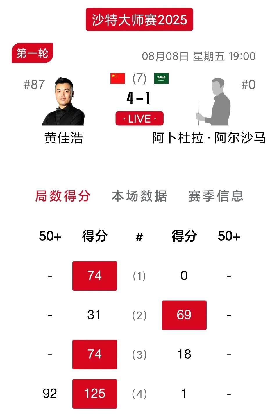 2025斯诺克沙特大师赛首轮,中国球员双双赢得开门红。晋级第二轮保底4000英镑奖金。 高阳4-1麦奎根 黄佳浩4-1阿尔沙马