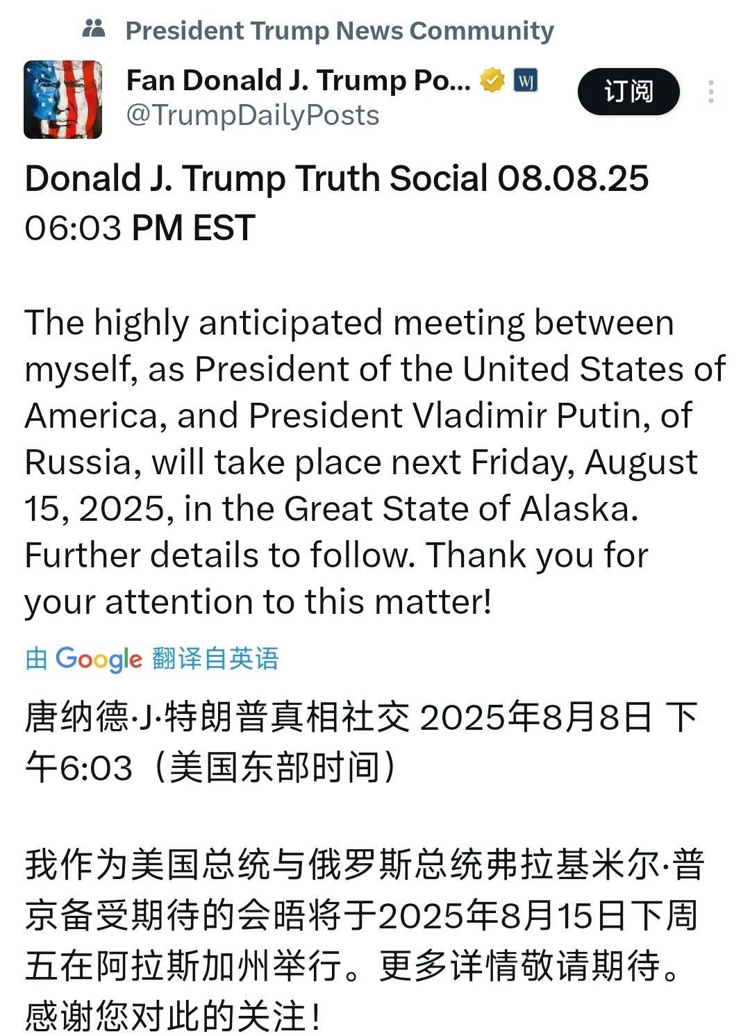突发消息:特朗普今天(北京时间8月9日)写道:“我作为美利坚合众国总统与俄罗斯总统弗拉基米尔·普京之间备受期待的会晤将于2025年8月15日星期五在伟大的阿拉斯加州举行。更多详情敬请期待。感谢您对此事的关注!” [机智]评几句:特朗普和普京即将在美国拉斯加举行特朗普第二任期的第一次美俄元首会晤,引发国际舆论的高度关注。很多国际网民对此进行调侃和讨论。有的说,特朗普可以把阿拉斯加归还给俄罗斯,以换取俄罗斯退出乌东四州,并签署俄乌和平协议。还有的调侃说,普京到了美国的领土,但是美国却不逮捕普京。实际上美国也不是《罗马条约》的签署国,国际刑事法院发出的所谓逮捕令,美国可以不执行。