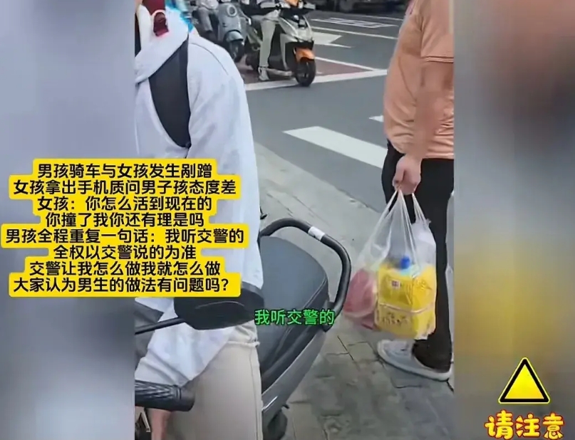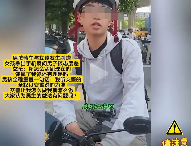 现在的女生真是可怕!近日某地发生一起骑车刮蹭事件,本来很普通也报了警,等警察来处理就好,可女生全程录视频并且咄咄逼人让男生承认是他的责任,并试图用言语激怒男生,企图让男生陷入自证清白的境地。 但男生很冷静,全程一直以:我听交警的,交警来了怎么定责我都接受为回应,不卑不亢的应对。女生看没达到目的竟上升到了人身攻击:骂男生你活到现在简直是奇迹、 你真牛逼!男生仍然没有情绪化,还是说,你说什么都没关系,我听交警的! 见目的没达到,女生说话的音量也小了很多。不得不佩服这个男生的冷静和聪明,这要是碰上一个脾气稍微不太好的或者像肖同学那样的,这个女生的目的肯定就得逞了!希望所有的男人都像这个男孩学习!