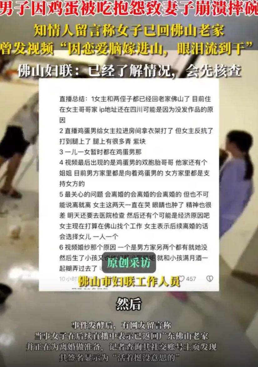 女子据说已经回佛山了,其嫂子马上买了几百块钱的榴莲,让孩子们和她随便吃!这是不是也在无声的讽刺着丈夫——连个鸡蛋都舍不得,买得起榴莲吗?