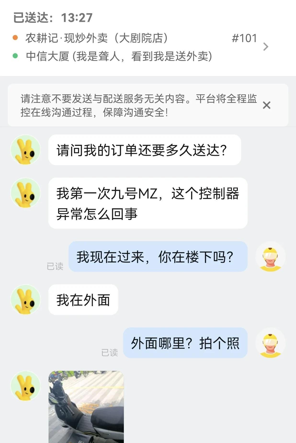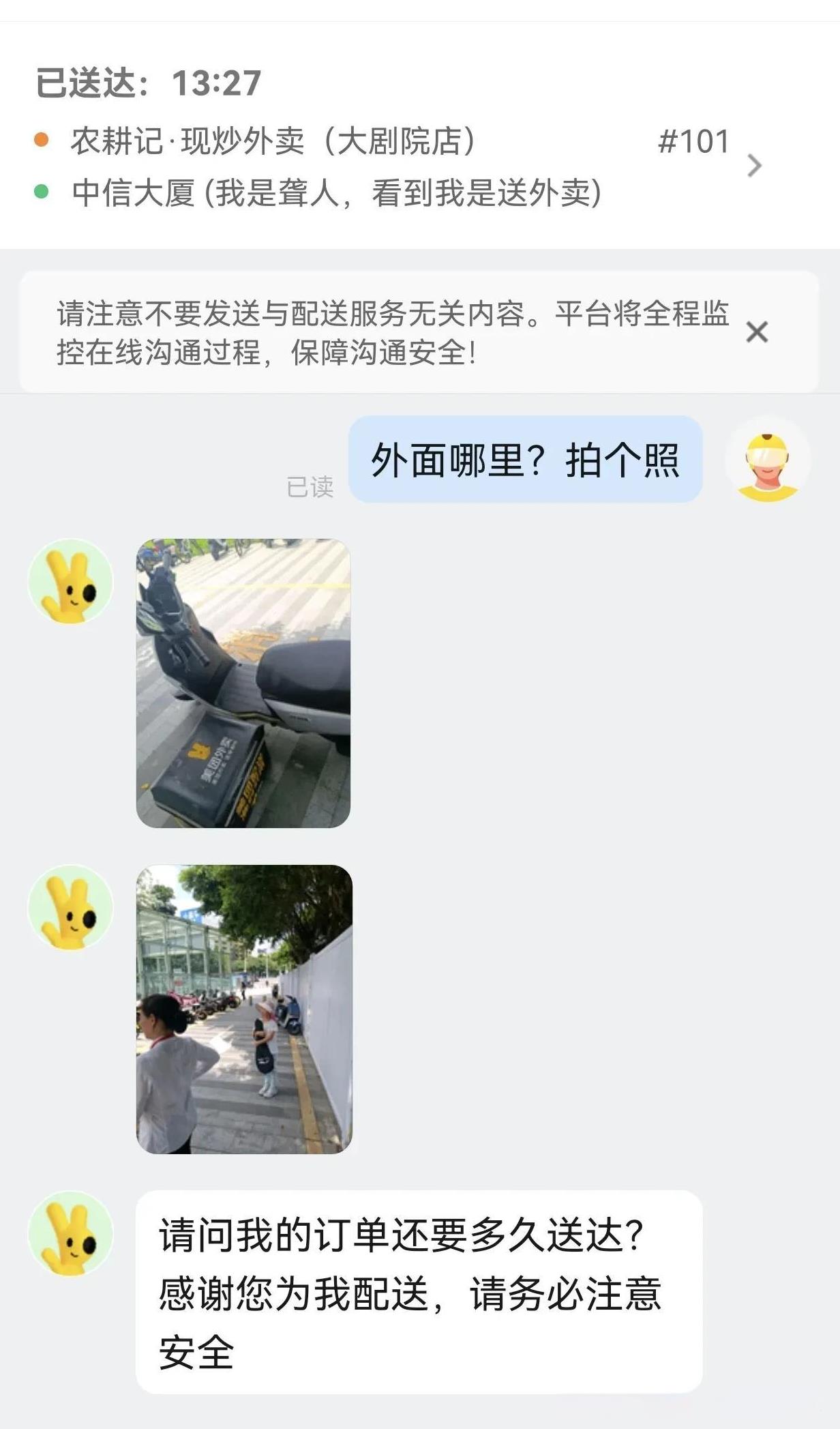 我接到这个订单,心里就在犯疑:我是聋人,看到我是送外卖。老天他听不到,打电话联系没用,送外卖,他是骑手还是楼下代送的?当时我手里挂了几个单,他的单时间最长,安排了在最后送! 当我手里还有三个单时,他催单了,发起了在线联系,我一看他会用在线联系,大喜过望。好,很好,这样我就不怕联系不上他了!我赶紧也在线联系里回复他,他立马回复了我,我叫他拍照,他也拍了,我一看照片大致猜他在哪里了! 我飞速骑车过去,眼睛快速扫一扫,很快看到了他,来到他身边,他正好看着一位代送员,我说“餐到了”,他没回头,我用餐触碰他的手,他才反应过来!老天,他真的听不到,年纪不大,二十多岁,挺清秀的,我当时赶时间去商场取餐,也没时间和他交流。他的车是新车,雅迪的,应该是车出了毛病,在那等师傅顺便点了个餐! 这是我第一次现实生活中接触到这个特殊群体!#听障人外卖# #聋人外卖员#
