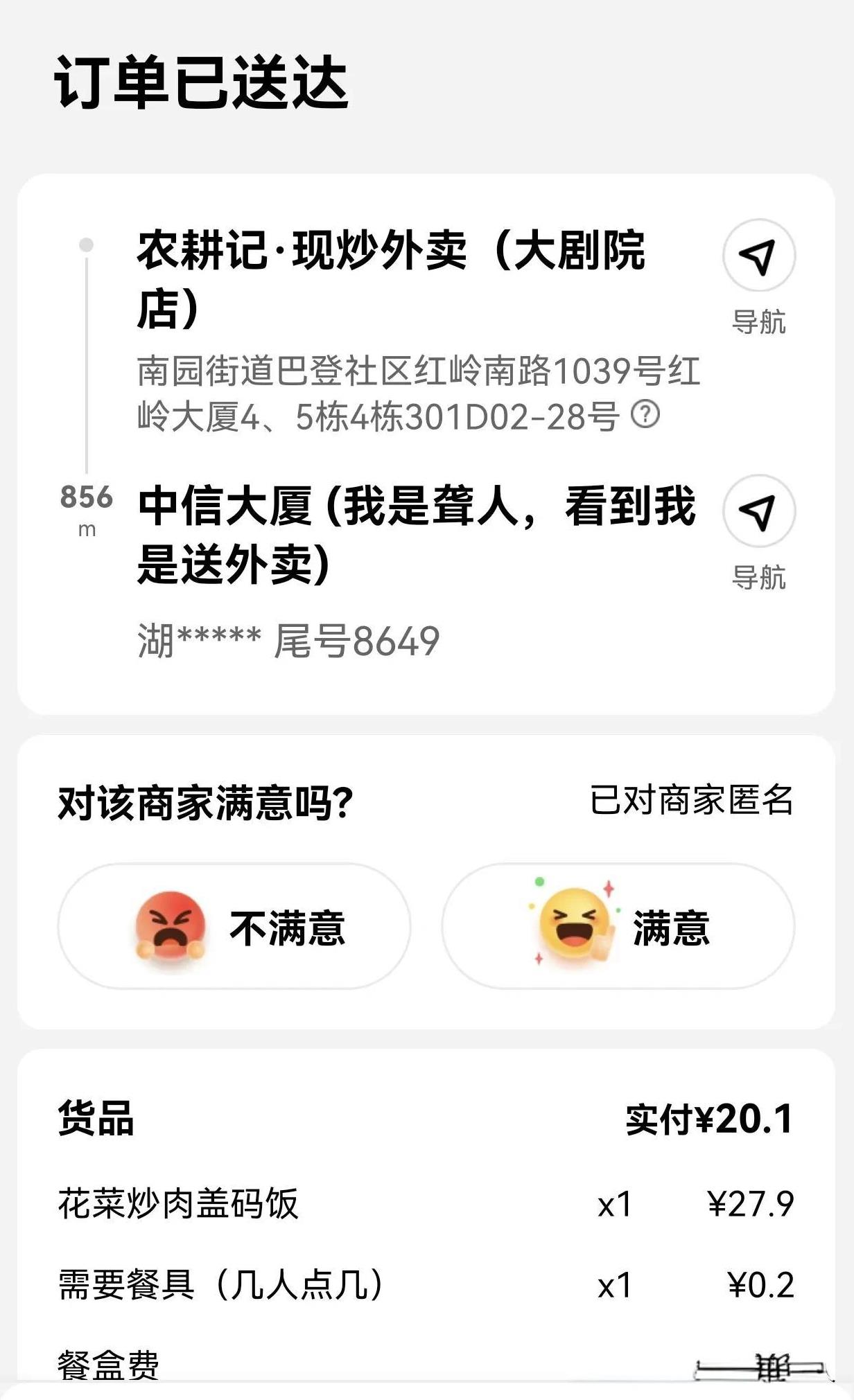 我接到这个订单,心里就在犯疑:我是聋人,看到我是送外卖。老天他听不到,打电话联系